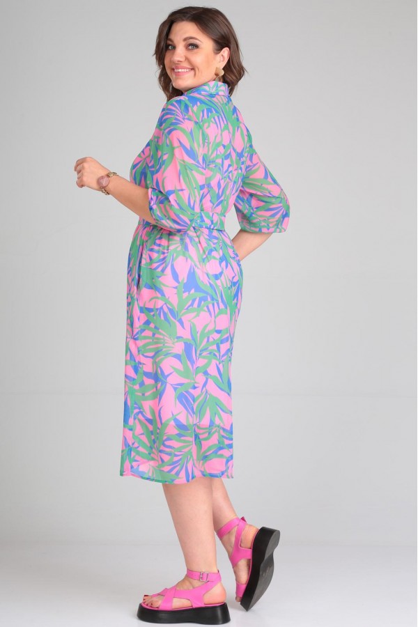 Платье А-образного силуэта под пояс, с подкладкой. Воротник рубашечного типа, планка с потайной застёжкой на петли пуговицы. В боковых швах карманы. Рукав ¾ на резинке. В комплекте пояс из основной ткани.