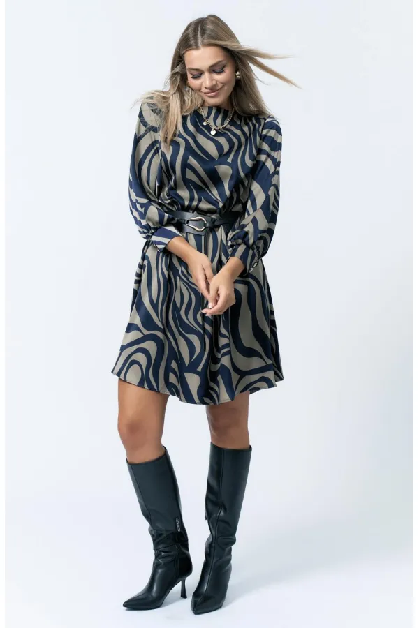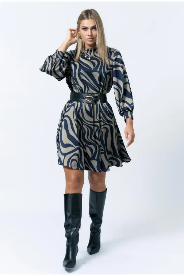 Платье женское А-образного силуэта. Горловина округлой формы. Рукав втачной.По низу рукава манжет застегивается на 2 петли пуговицы. Спинка со средним швом. По спинке вырез с застежкой на петлю пуговицу.