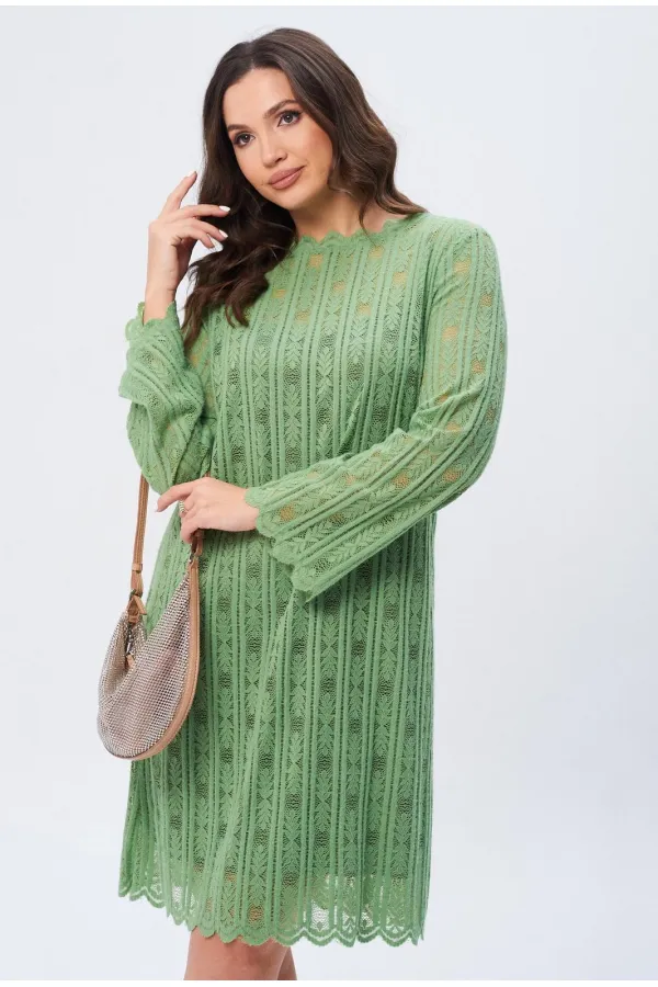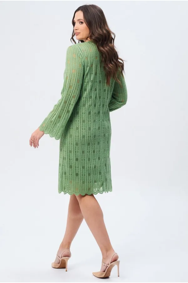 Элегантное женское платье А-образного силуэта, созданное для изысканных образов. Модель выполнена из высококачественной кружевной ткани зелёного цвета с изысканным геометрическим узором, который придает особый шарм. Платье дополнено ажурной горловиной со стойкой, что добавляет изделию тонкой элегантности. Застежка на спине на петлю и пуговицу обеспечивает удобство при надевании. Рукава платья втачные, слегка расширенные книзу, добавляют образу нотку романтической невесомости. Подкладка гарантирует комфортное ношение. Это платье — идеальный выбор для торжественных событий и важных встреч.