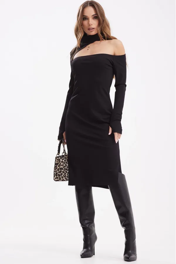 Платье прилегающего силуэта из трикотажного полотна. Воротник стойка. Застежка в среднем шве спинки на потайную молнию. Слева разрез 29см. Рукав длинный с отверстием для большого пальца. По переду вырез асимметричной формы с открытым левым плечом.