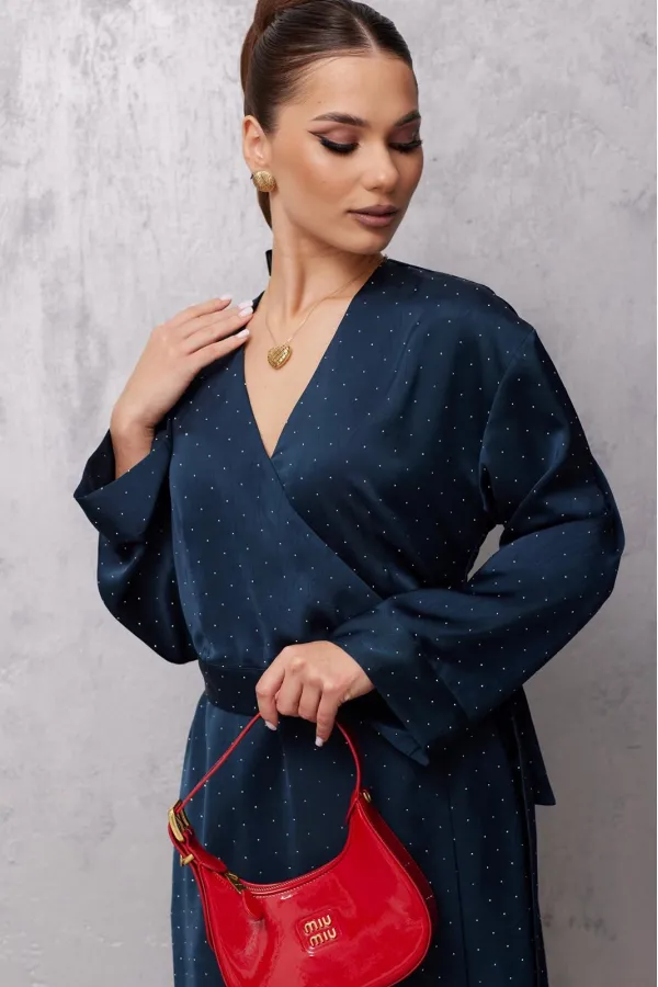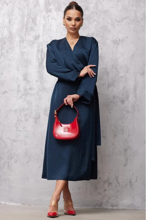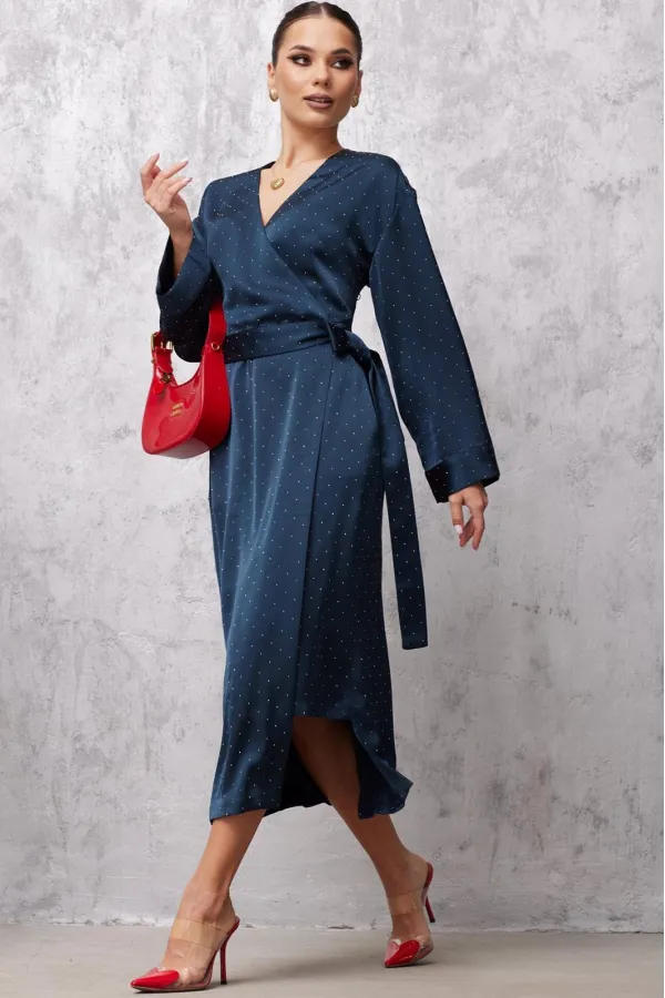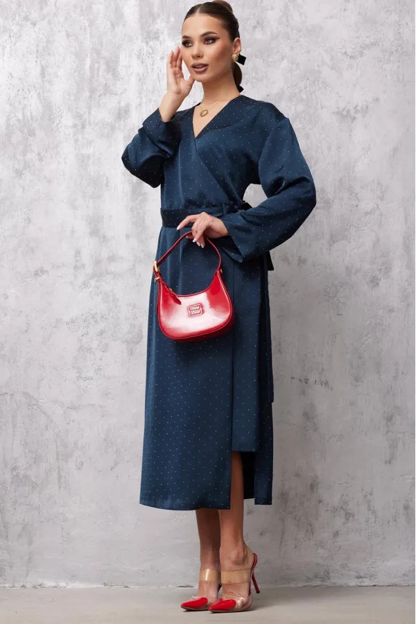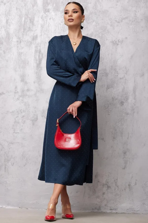 Платье на запах с асимметричной линией низа. Длина миди. Платье отрезное по талии. Вырез горловины V-образный. Рукав прямой с манжетой понизу. По талии платье фиксируется широким завязывающимся поясом. Платье на подк... Читать далее...