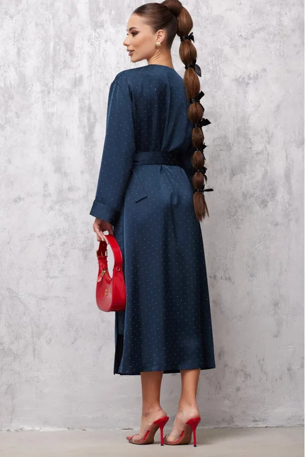 Платье отрезное по талии. Вырез горловины V-образный. Рукав прямой с манжетой понизу. По талии платье фиксируется широким завязывающимся поясом. Платье на подкладке.
