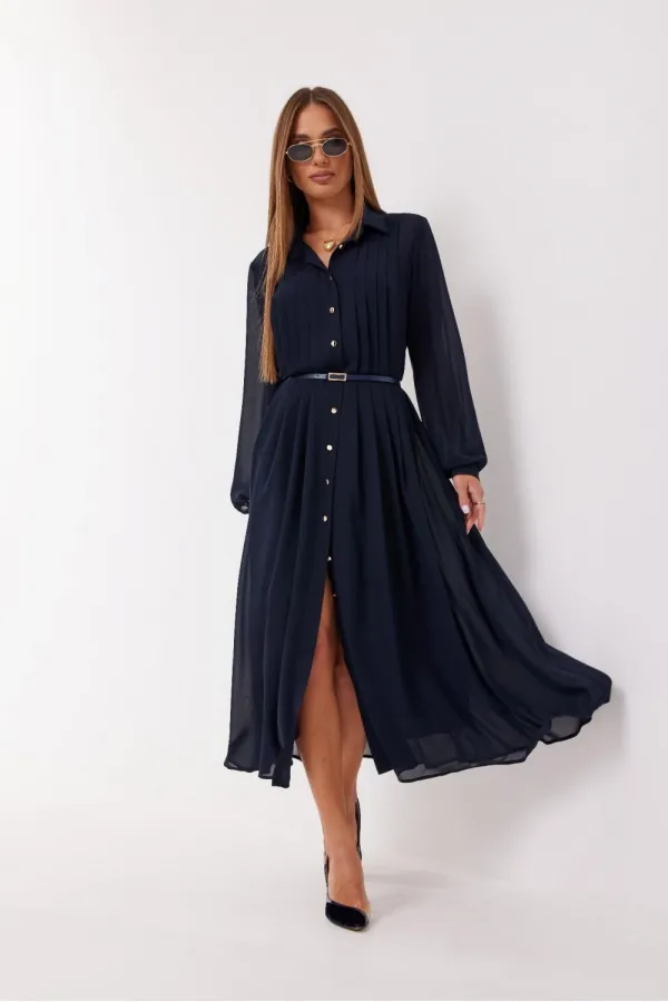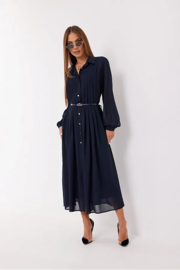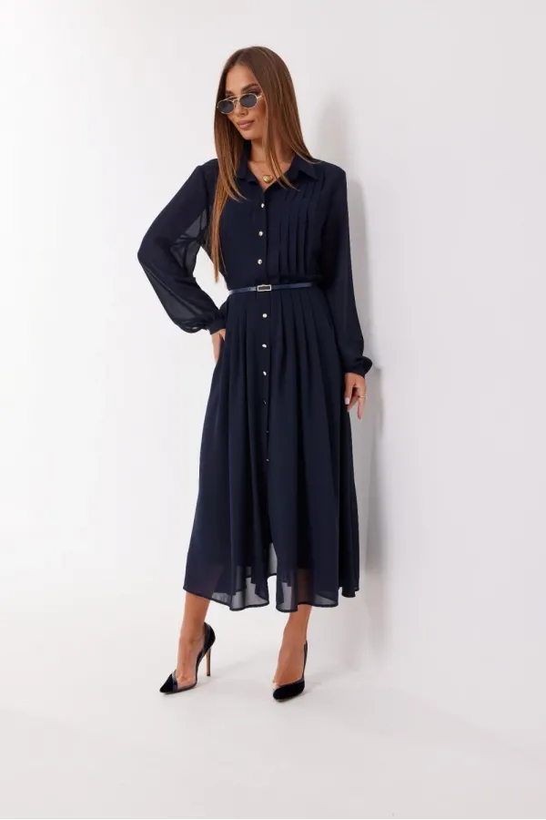 Платье из креповой ткани. Длина миди. Застёжка по переду на петли и пуговицы. Воротник рубашечный. Платье отрезное по талии. Рукав прямой со сборкой по низу на манжете. Манжета с застёжкой на петлю и пуговицу. По переду застрочены складки. Юбка расширена к низу, по талии заложены складки. Юбка платья на подкладке. В комплекте съёмный пояс.