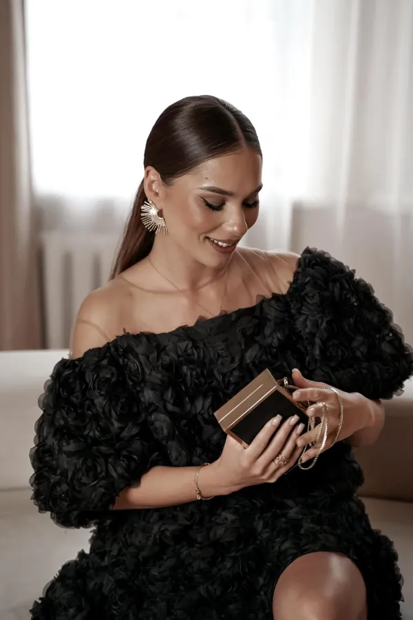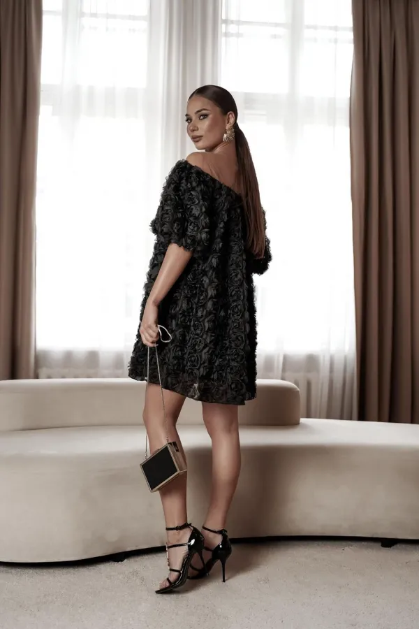 Платье А-силуэта. Длина мини. Горловина круглой формы. По горловине спинки застежка на крючок. По переду и спинке кокетка из сетки. Рукава съемные пышной формы. Платье на подкладке.