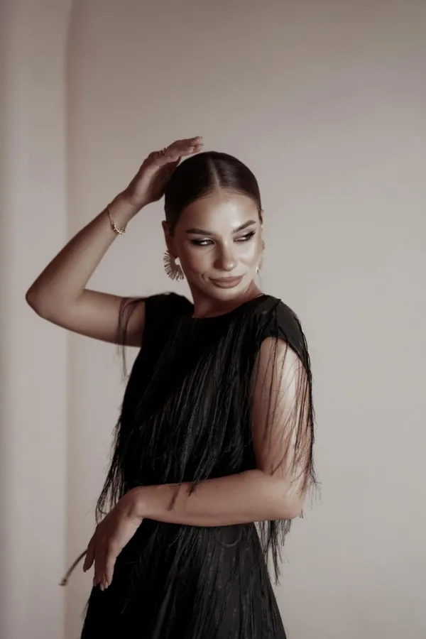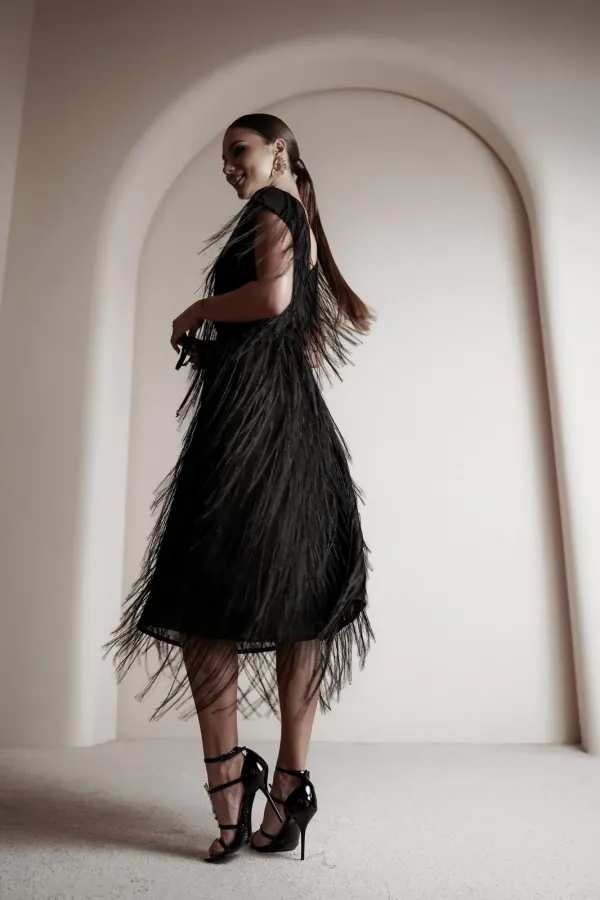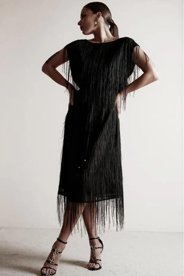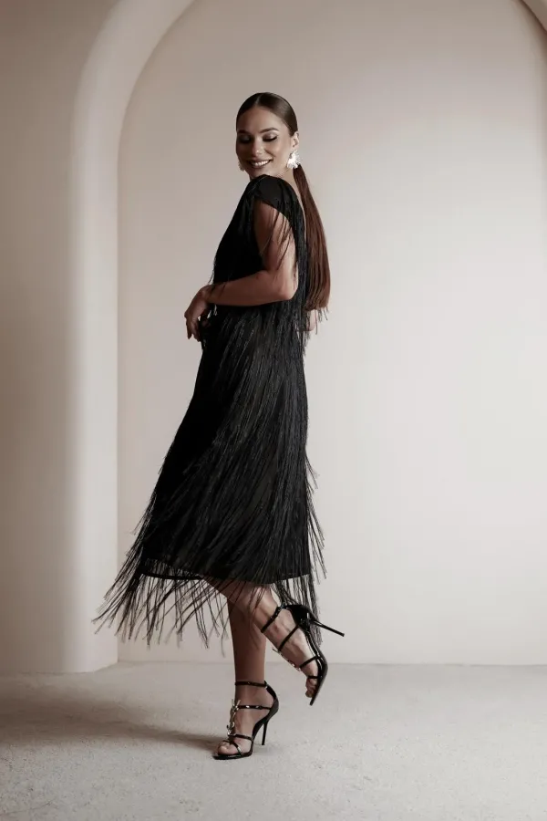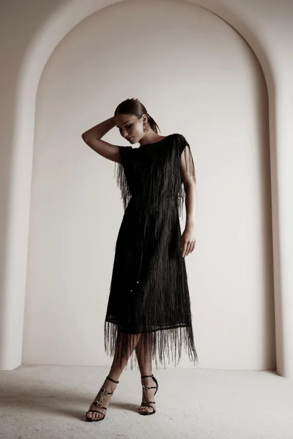Платье свободного силуэта чуть расширенное к низу, с коротким цельновыкроенным рукавом, из нарядной плательно-блузочной ткани с бахромой. По переду горловина округлой формы, по спинке-V-образной. Платье на атласной подкладке.