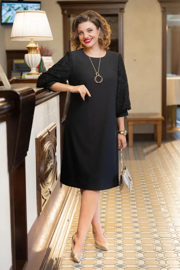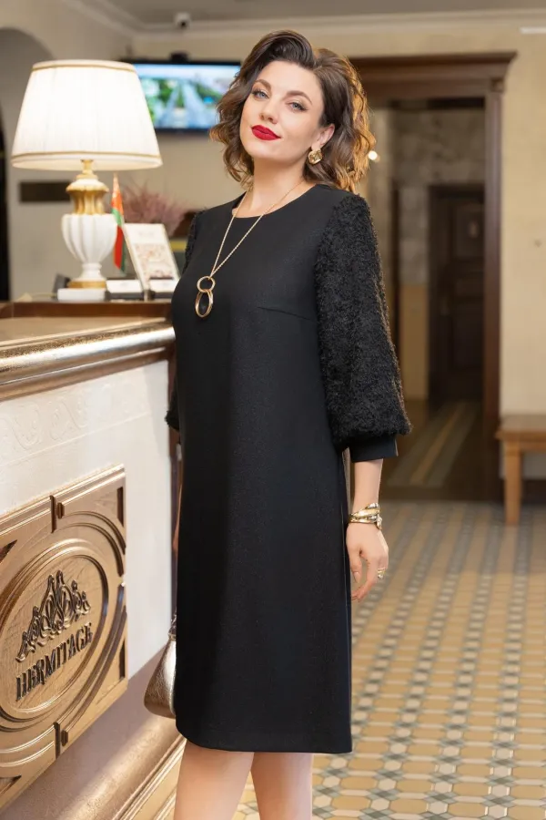 Платье А-образного силуэта с естественной линией плеча.Спинка со средним швом и застежкой на молнию.Перед с нагрудными вытачками.Вырез горловины округлой формы.Рукав втачной одношовный длиной 3/4 из отделочной ткани ресн... Читать далее...