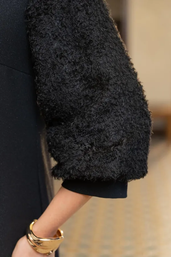 Платье А-образного силуэта с естественной линией плеча.Спинка со средним швом и застежкой на молнию.Перед с нагрудными вытачками.Вырез горловины округлой формы.Рукав втачной одношовный длиной 3/4 из отделочной ткани реснички типа баллон с манжетой по низу.В комплект к платью входит декоративная подвеска.