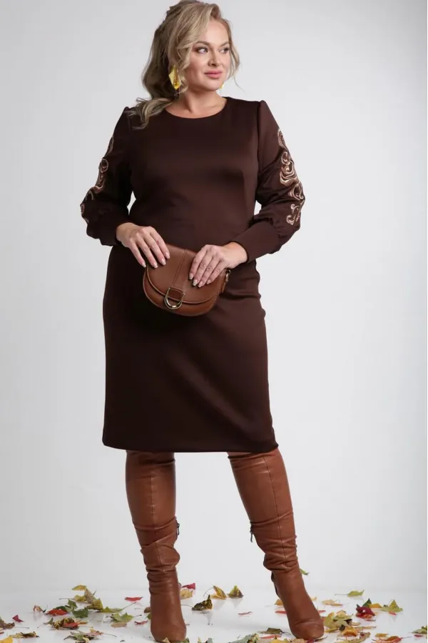 Платье женское полуприлегающего силуэта из трикотажа с декоративной вышивкой по рукавам. Перед с фигурными вытачками, выходящими из бёдер. Спинка со средним швом, заканчивающимся шлицей и с потайной молнией. Рукав втачной со сберкой по окату и низу с двойной манжетой. Длина платья по спинке - 101 см. Длина рукава - 61 см.