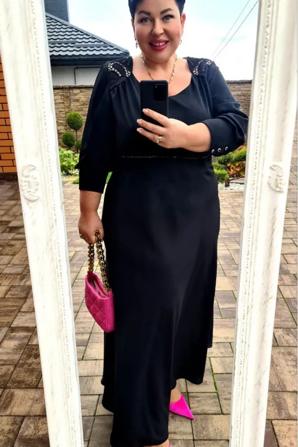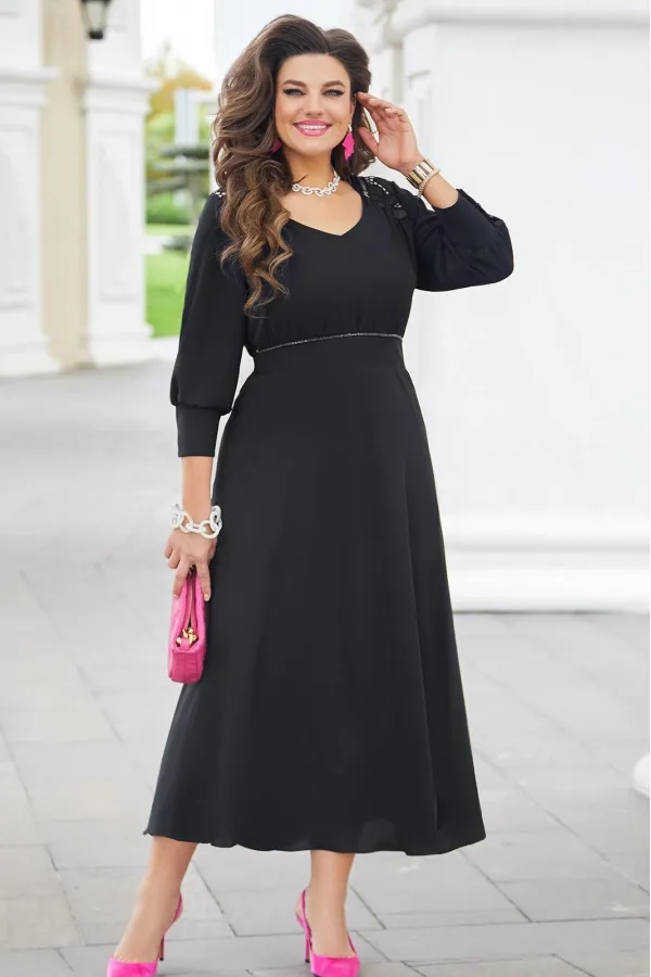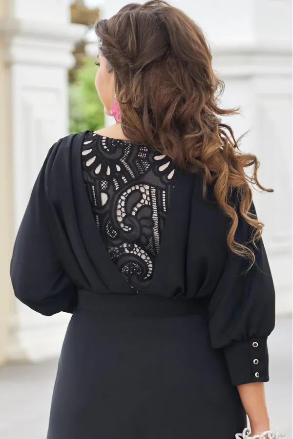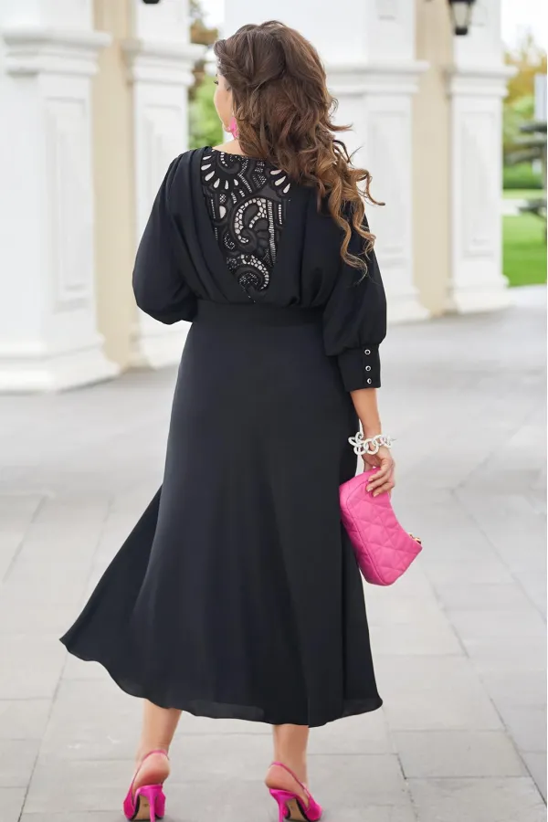 Шикарное женское платье классического черного цвета, а вставки из модного кружева делают Ваш образ нарядным и изысканным. В данном платье Вы будете неотразимы как на праздничной вечеринке, так и в вечернем выходе. Легкое платье с V- образным вырезом и кокетками из кружева на груди создает красивую зону декольте. Слегка завышенная линия талии с втачным поясом и декоративной тесьмой, и сборкой под грудью переходит в пышную струящуюся юбку. Спинка платья с V-образной вставкой из кружева и встречными деталями с заложенными складками, направленными к центру спинки. Рукав втачной снизу собран на высокую манжету с пуговицами. Платье на подкладке с застёжкой на молнию в боковом шве, благодаря универсальной длине миди ниже колена платье подойдет на женщин разного роста. Длина платья от высшей точки плечевого шва до низа 131 см (р.50-54), 134 см (р.56-60). Длина рукава 49 см.Подробные замеры смотрите на дополнительном фото. Подходит на рост 164-170.