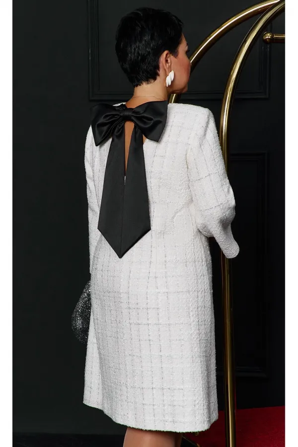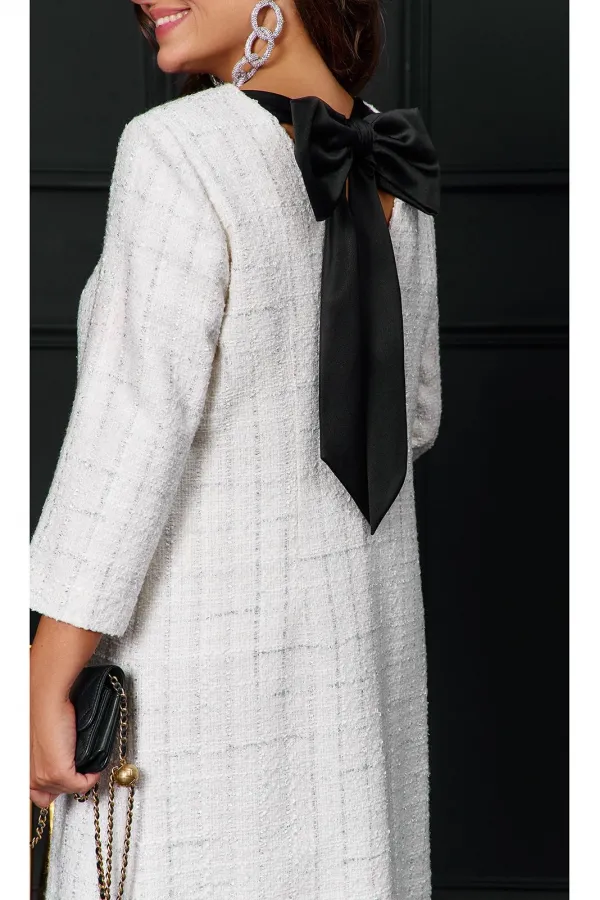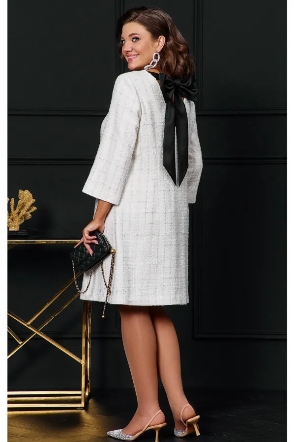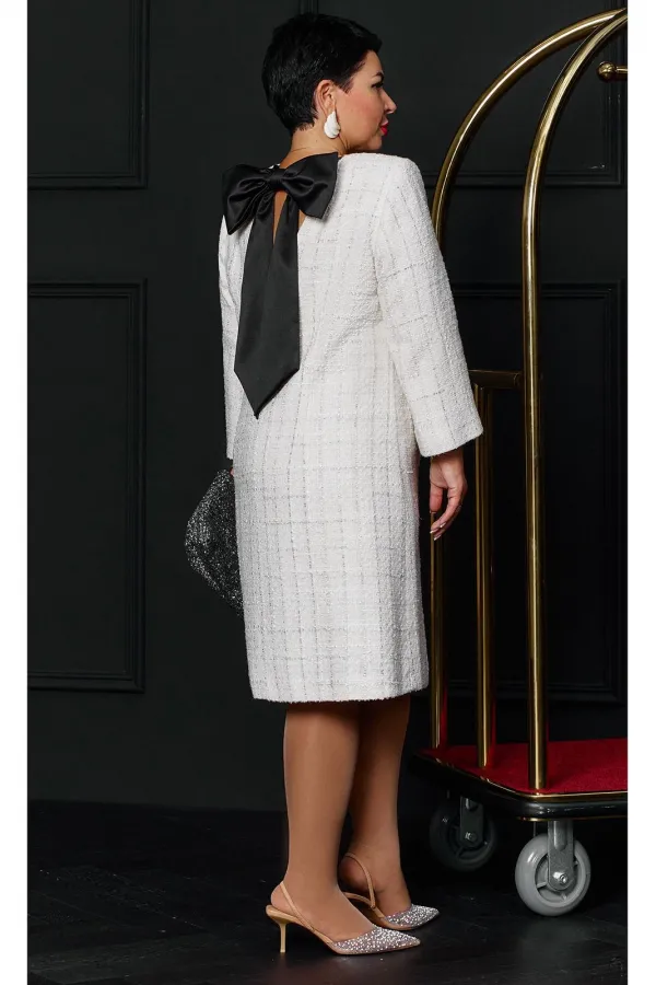 Шикарное платье в стиле «шанель», лаконичное с ярким акцентом в виде декоративного банта по спинке из отделочной контрастной ткани – это образ сдержанной красоты и делают Вас поистине роскошной! Платье лёгкого А-силуэта с ровной линией плеча, горловина округлой формы, длина платья до колена. По переду платья нагрудные вытачки. Спинка со средним швом и талиевыми вытачками, в V-образном вырезе горловины декоративный бант, которым можно регулировать высоту на лентах. Рукав в платье втачной, длинный, немного расширяется к низу.