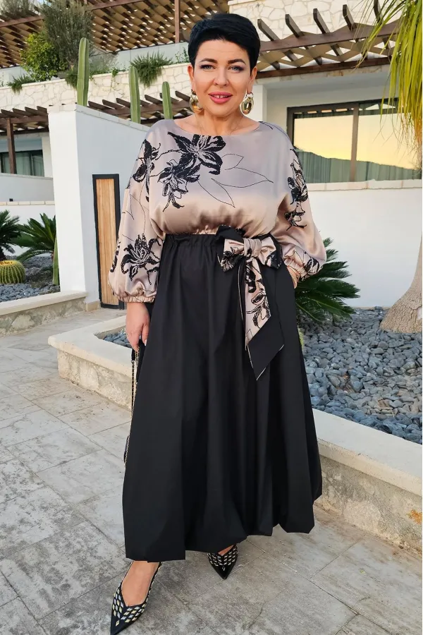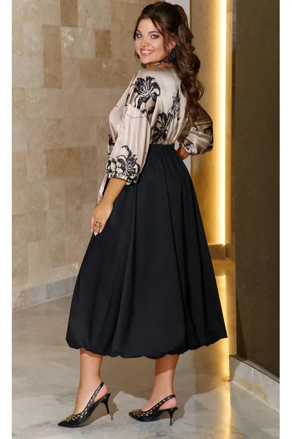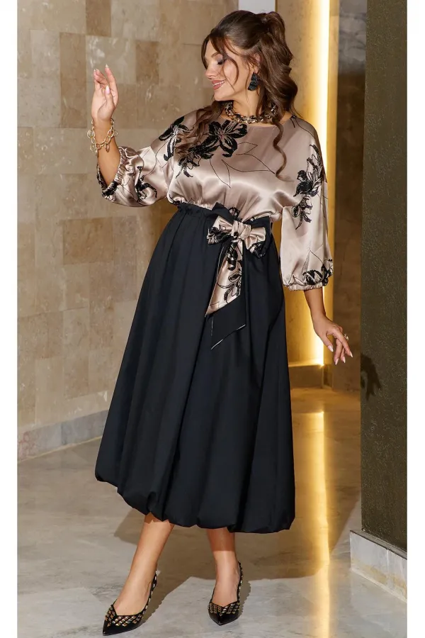 Невероятно красивое и элегантное платье отвечает всем требованиям вечернего наряда! Сочетание тканей разных фактур и дизайнов в одной модели - тренд сезона. Для лифа с мягкими присборенными рукавами мы выбрали пластичный атлас, а формоустойчивую тафту - для создания модной юбки «баллон». Сдержанный блеск атласа с деликатным принтом подчеркивает глубину тона черной тафты. Платье отрезное по талии, с круглой горловиной. Рукав длиной 7/8 со спущенной проймой и сборкой по низу на резинку. Длинная юбка «баллон» собирается по талии на эластичную ленту в отрезном поясе. По поясу платье декорировано бантом в виде съемной броши. Длина платья от высшей точки плечевого шва до низа – 129 см (р.48-52)- 130 см (р.54-58). Длина рукава – 31 см.Подробные замеры смотрите на дополнительном фото. Подходит на рост 164-170.