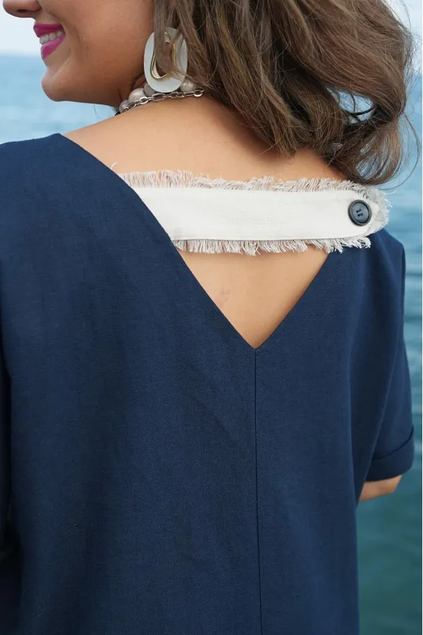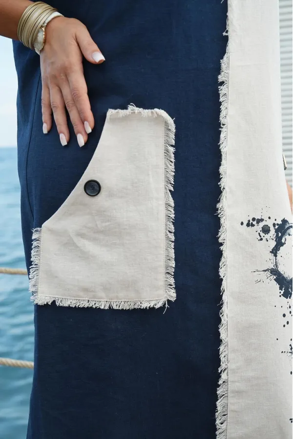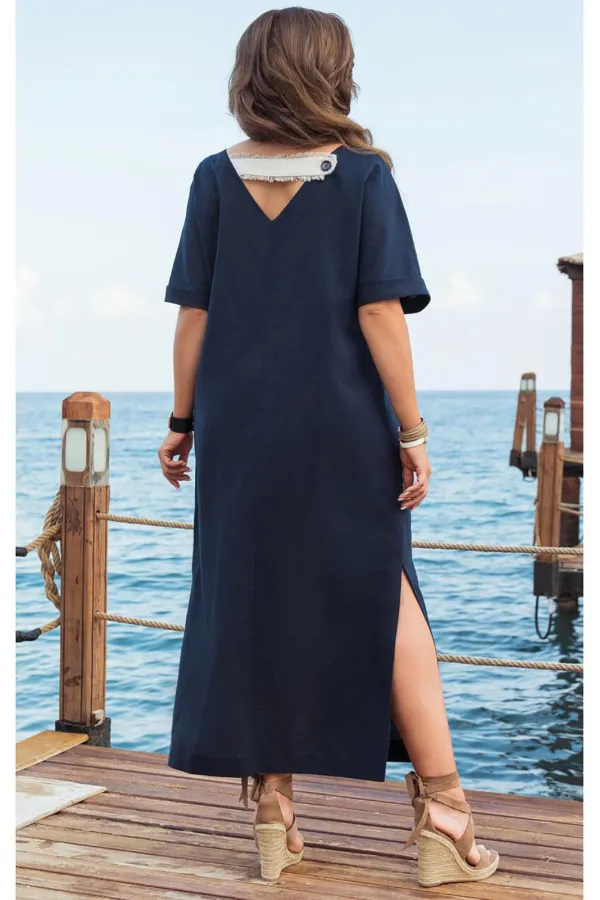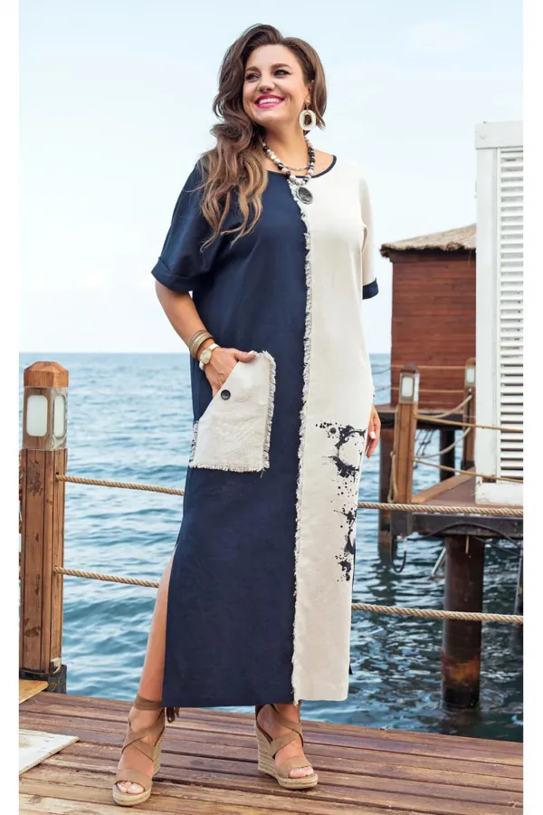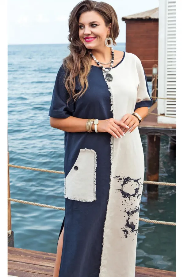 Платье женское идеально для жаркого лета, простой крой, не сковывающий движения. Платье сочетает в себе комбинацию контрастных цветов, а дизайнерская печать по детали переда добавляет яркий акцент. Платье прямого силуэта, длинное с высокими разрезами в боковых швах. Горловина в платье округлой формы, линия плеча, спущенная с притачной манжетой по низу. По переду платья вертикальный подрез со вставкой из бахромы, по правой половинке платья настрочной фигурный карман с декоративной отделкой в виде бахромы и декоративной пуговицы. Спинка с V-образным вырезом по горловине, притачной патой с декоративной отделкой в виде бахромы и декоративной пуговицы. Спинка со средним швом. Длина платья от высшей точки плечевого шва до низа 135 см (р.52-56), 139 см (р.58-62). Длина рукава 20 см.Подробные замеры смотрите на дополнительном фото. Подходит на рост 164-170.