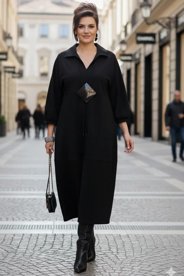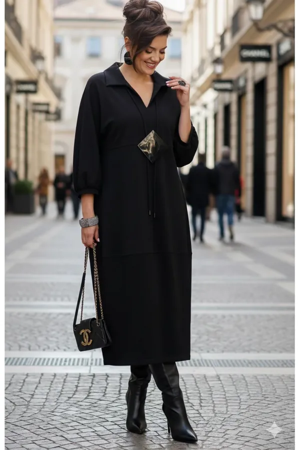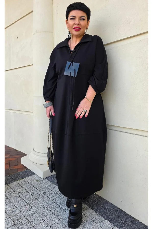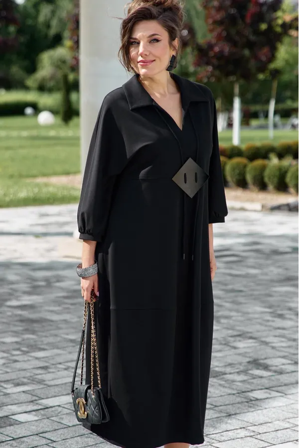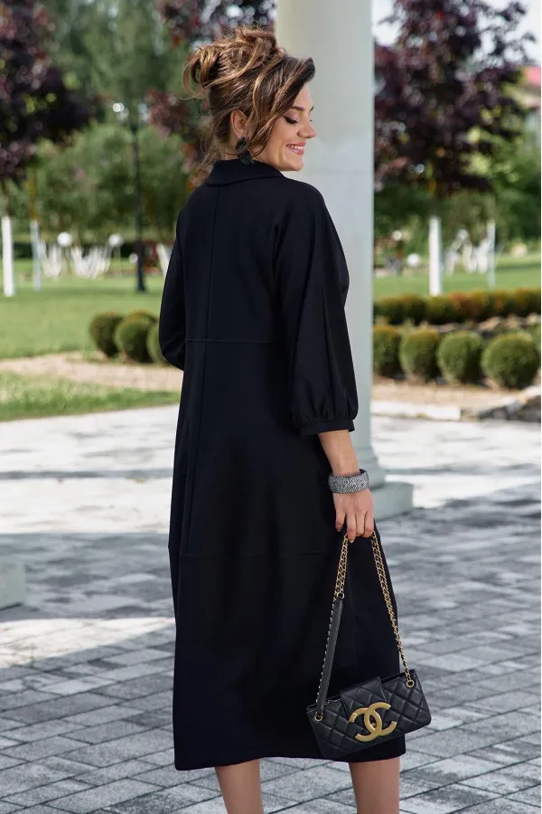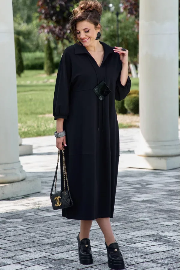 Представляем вашему вниманию элегантное платье миди в насыщенном чёрном оттенке, который актуален в любом сезоне. Выполненное из мягкой, струящейся ткани, оно обеспечивает приятные ощущения при носке и безупречную посадку. Свободный крой платья напоминающий собой форму «купола» слегка заужается к низу придает силуэту изящество и позволяет ему деликатно ниспадать по фигуре. V-образный вырез горловины, дополненный отложным воротником, придает платью классический и в то же время современный вид. Линия талии завышенная, лиф платья двойной, со средним швом. Рукав в платье цельнокроеный со сборкой на манжету, добавляют образу непринужденности и объема. Горизонтальный шов, расположенный примерно на уровне бедер, создает интересный структурный акцент. В боковых швах карманы. В качестве дополнительного декоративного элемента в комплекте с платьем идёт украшение ручной работы. Длина платья 125 см., длина рукава 62,5 см (р 52-56), 64,5 см (р 58-62).Подробные замеры смотрите на дополнительном фото. Подходит на рост 164-170.