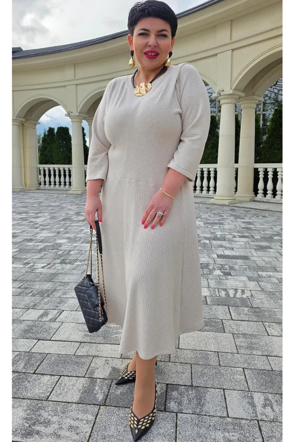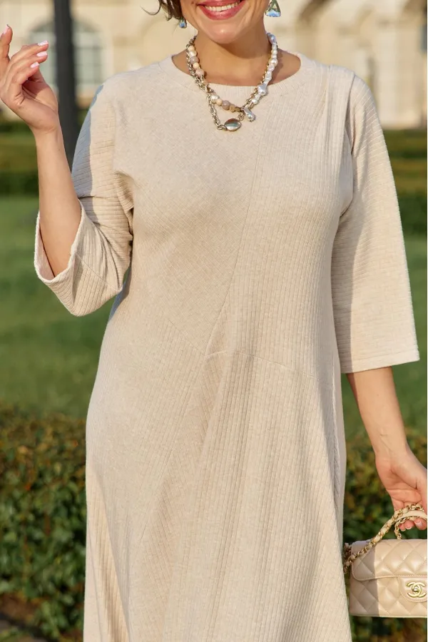 Платье выполнено из высококачественного трикотажа в рубчик, известного как лапша, это платье обеспечивает приятные тактильные ощущения и отличную посадку по фигуре. Силуэт клеш от талии деликатно ниспадает, создавая летящую, женственную форму, которая подчеркивает достоинства фигуры и дарит свободу движений. Горловина округлой формы, оформлена бейкой. По переду платья фигурные подрезы, позволяющие полоске в платье ложиться в разных направлениях создавая интересный образ; у плеча декоративная заложенная складка. Рукав в платье цельнокроеный. Длина миди и рукава три четверти придают платью утонченный и завершенный вид. Длина платья 119 см, длина рукава 52 см.Подробные замеры смотрите на дополнительном фото. Подходит на рост 164-170.