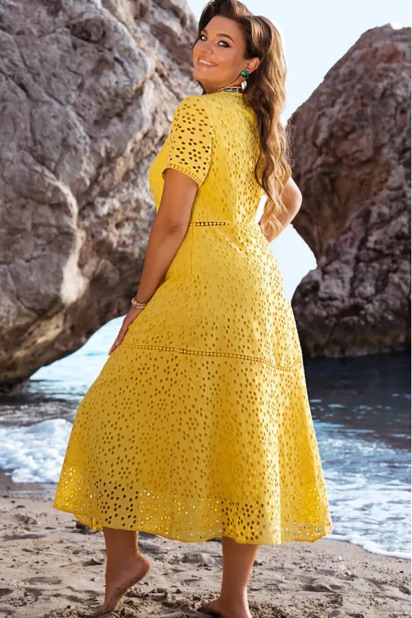Платье в сдержанном элегантном стиле, из натурального хлопка с вышивкой ришелье, которое станет украшением Вашего гардероба. Платье А-силуэта с рельефами по лифу, округлой горловиной и кокеткой со вставкой из кружева на просвет. Платье отрезное по линии талии со вставкой из кружева на просвет в подрезе. По спинке вырез капелька с застёжкой на пуговицу, талиевые вытачки от подреза. По низу платья притачной волан фигурной формы со вставкой кружева в подрезе. Низ в платье ассиметричный. Рукав втачной, короткий с кружевом по низу. В боковом шве платья застёжка на тесьму-молнию. Платье на подкладке.
