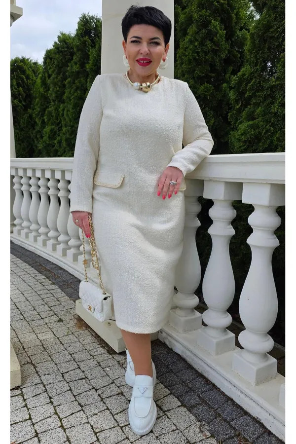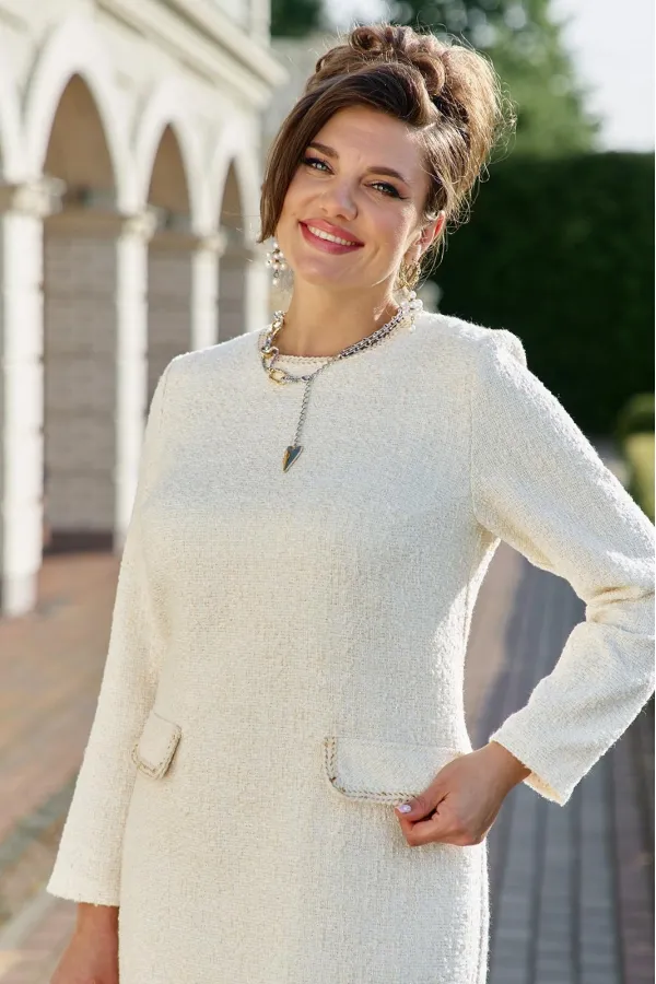 Безумно красивое и элегантное платье в модном оттенке «сливочного масла» мягко обволакивает фигуру, создавая тем самым шикарный образ. Его стиль, утончённость делает женщину поистине роскошной. Платье идеально подойдёт как для повседневной носки, так и для торжественных выходов, подчеркивает достоинства фигуры и успешно скрывает все недостатки. Платье прилегающего силуэта с округлой горловиной с отделкой в виде декоративной отделочной тесьмы. По переду платья нагрудные вытачки, отделочные клапана карманов с декоративной отделкой в виде тесьмы. По спинке застёжка на декоративную тесьму-молнию. Рукав в платье втачной, длинный. Платье на подкладке. Длина платья 111 см (р 48-52), 111,5 см (р 54-58), длина рукава 61 см.Подробные замеры смотрите на дополнительном фото. Подходит на рост 164-170.