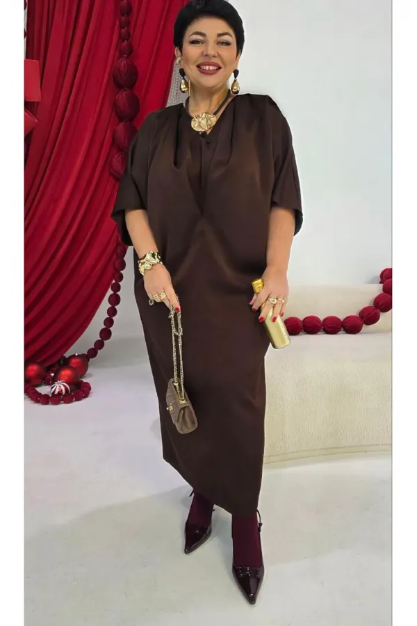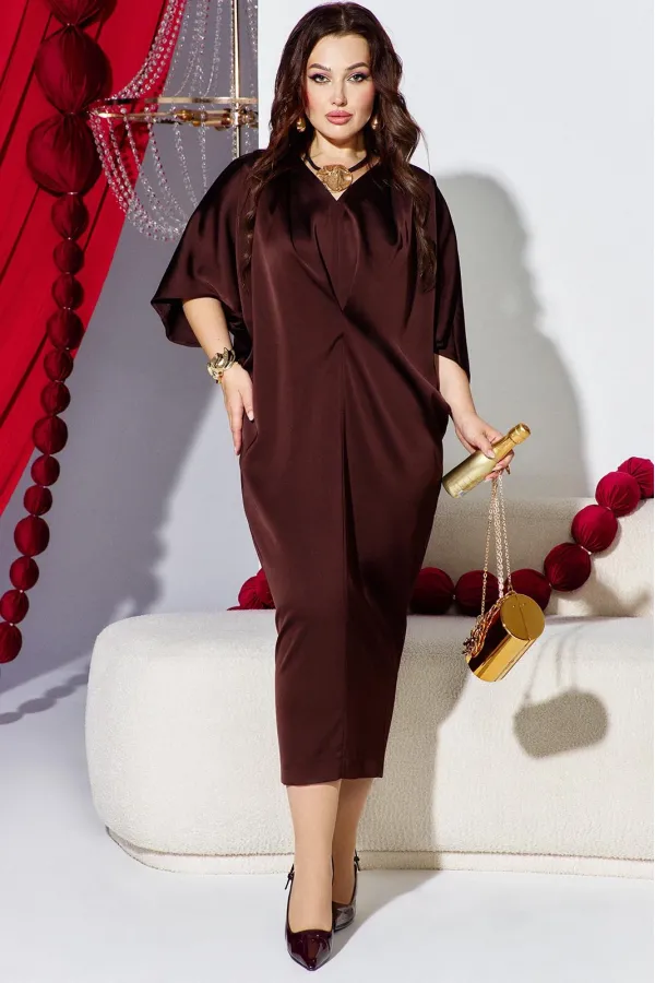 Это платье — олицетворение силы и изящности: ярко, но не кричаще. Уверенный, волнующий наряд для торжественных мероприятий и важных встреч. Силуэт «летучая мышь» мягко обтекает фигуру, создавая плавный переход между линией плеч и линией талии, затем свободно распускается по бокам, позволяя ткани играть волной при каждом движении. Вырез горловины V-образной формы подчёркивает изящную шею, а рукава добавляют образу лёгкую драматичность и женственность. По переду платья средний шов, с застроченной складкой выше уровня талии переходящую в складку по плечу. Спинка в платье со средним швом с разрезом от низа. Рукав в платье цельнокроеный со щеловидным вырезом проймы. Длина платья 123 см, длина рукава 48 см (р 52-56), 48,5 см (р 58-62).Подробные замеры смотрите на дополнительном фото. Подходит на рост 164-170.
