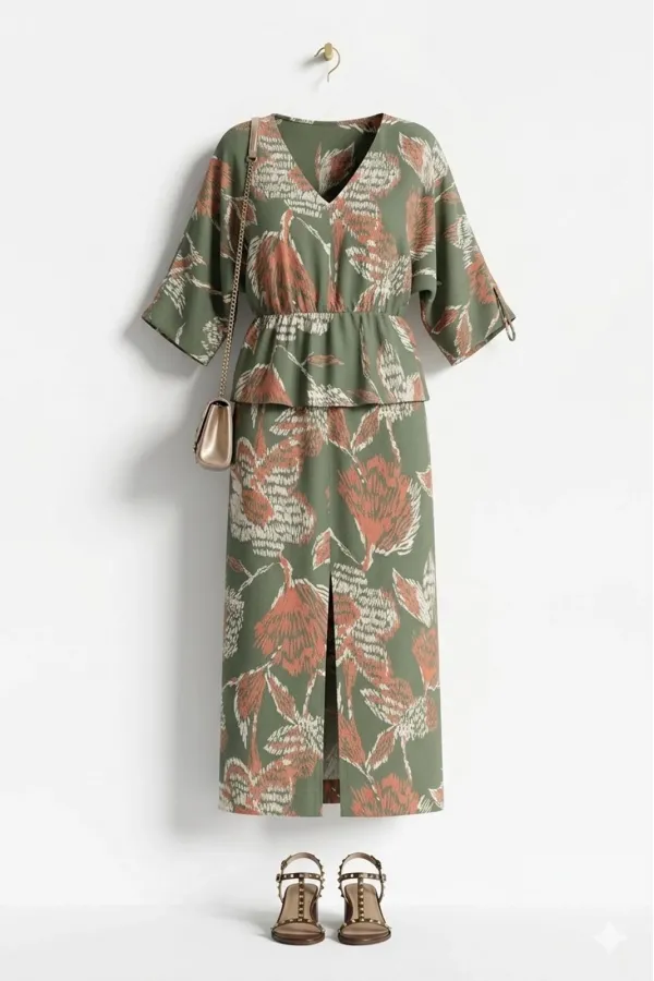 Платье с идеальной посадкой по фигуре, легкое, дышащее, струящееся. Натуральный тенсел обволакивает тело шелковистой прохладой, материал обладает благородной матовой фактурой, которая мягко переливается при движении, создавая игру света и тени. Поверхность платья украшает завораживающий абстрактный принт. Платье длины миди — элегантно ниспадает до середины икры, создавая удлиненный, стройный силуэт. Платье прилегающего силуэта, за счёт вставки в подрезе эластичной тесьмы-резинки, которая обеспечивает удобное прилегание. Горловина в платье с плавным V-образным вырезом, лиф с средним швом. Цельнокроеные рукава плавно переходят от линии плеча, создавая бесшовный, обтекаемый силуэт. Особенность — декоративная кулиска, которая: позволяет регулировать степень длину, добавляет элемент неожиданности и дизайнерской мысли. Рукав длиной ¾. Лиф спинки платья со средним швом, плавным V-образным вырезом с декоративными лентами завязывающимися на бант. Выше уровня талии расположена декоративная баска — изящное архитектурное решение, которое: подчеркивает линию талии, создавая эффект песочных часов, добавляет объем в верхней части, контрастируя с прямым низом, играет роль акцентного элемента, привлекающего внимание, создает легкую воздушность и романтичность. В среднем шве переда платья высокий разрез. Длина платья 138 см.Подробные замеры смотрите на дополнительном фото. Подходит на рост 164-170.