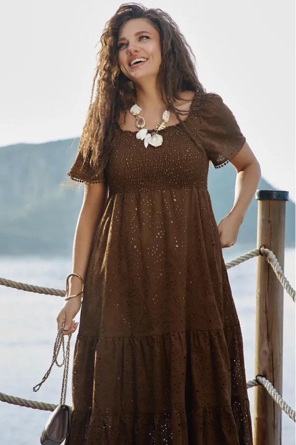 Женское платье из ришелье, в изысканном шоколадном оттенке, является настоящим произведением искусства, создавая гармоничное сочетание, которое привлекает внимание и восхищает. Дополняя это платье аксессуарами, которые гармонично подчеркнут общий образ— Вы будете выглядеть изящно, чувствовать себя увереннее и привлекательнее в любой обстановке: будь то романтический вечер, встреча с подругами или прогулка по городу. Таким образом, женское платье из ришелье в шоколадном оттенке становится не просто предметом гардероба, а истинным символом стиля, элегантности и безупречного вкуса. Платье прилегающего силуэта с фигурным вырезом горловины. Лиф платья на венгерке, что обеспечивает максимально удобную посадку на любую фигуру, по окату рукава вставка из резинки на сборке. Рукав в платье короткий с отделкой декоративным кружевом по низу. В боковых швах платья карманы, по низу притачной волан со сборкой от подреза. Подкладка в платье контрастного цвета выбрана не случайно, бежевый оттенок пробивается через вышивку ришелье делая образ более ярким. Длина платья 121 см (р 50-54), 123 см (р 56-60). длина рукава 28,5 см (р 50-54), 30 см (р 56-60).Подробные замеры смотрите на дополнительном фото. Подходит на рост 164-170.