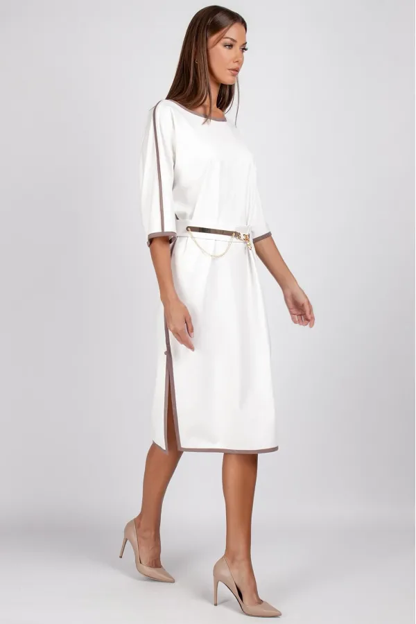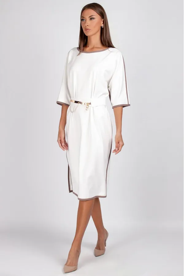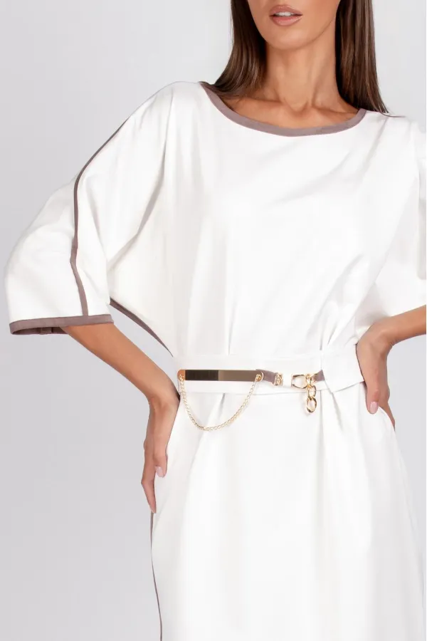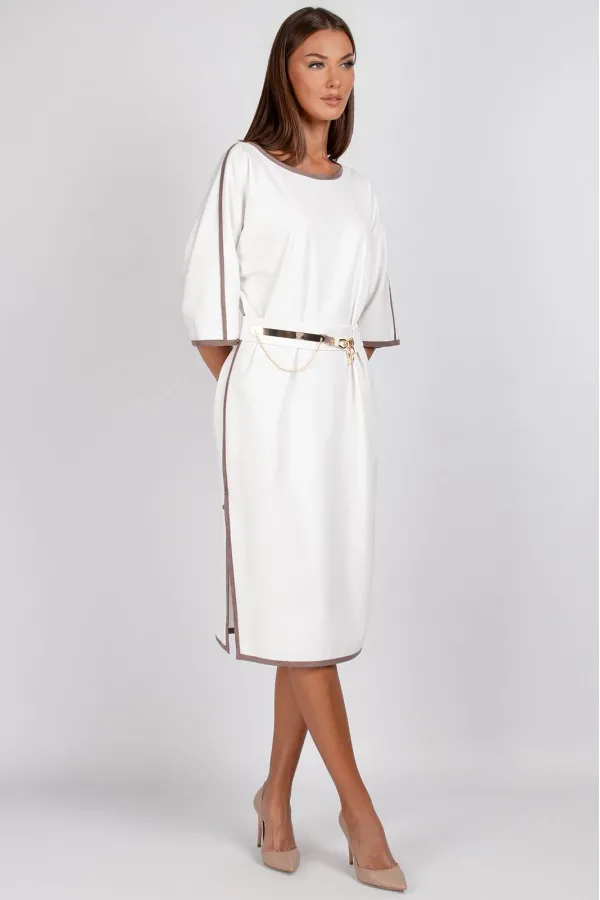 Съёмный пояс с металлическими элементами цвета золота подчёркивает талию и завершает композицию, превращая платье в универсальный вариант для офиса, прогулок или вечерних мероприятий.