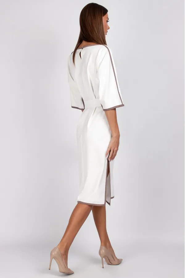 Контрастная отделка по горловине, рукавам, плечевым и боковым швам придаёт модели выразительность, а декоративная пуговица на боковом разрезе добавляет изящный акцент.