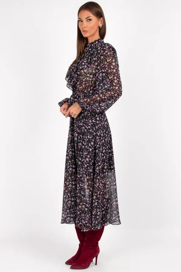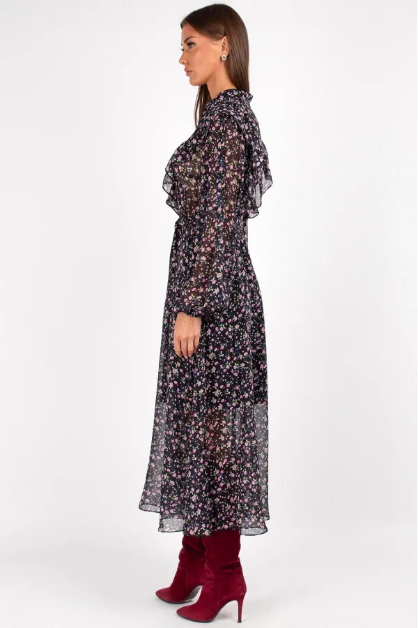 Платье женское полуприлегающего силуэта, отрезное по линии талии на резинке. Передняя часть платья с нагрудными вытачками, швом посередине, с кокеткой и вставленной в нее рюшей. Перед с застежкой на 3 навесные петли и пу... Читать далее...