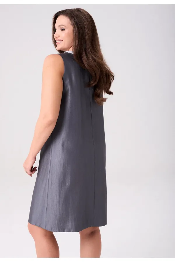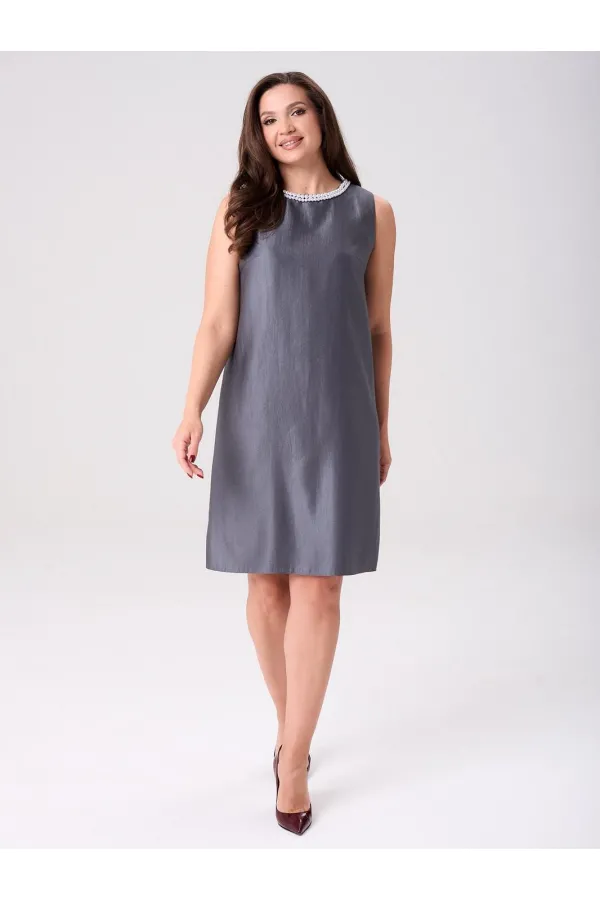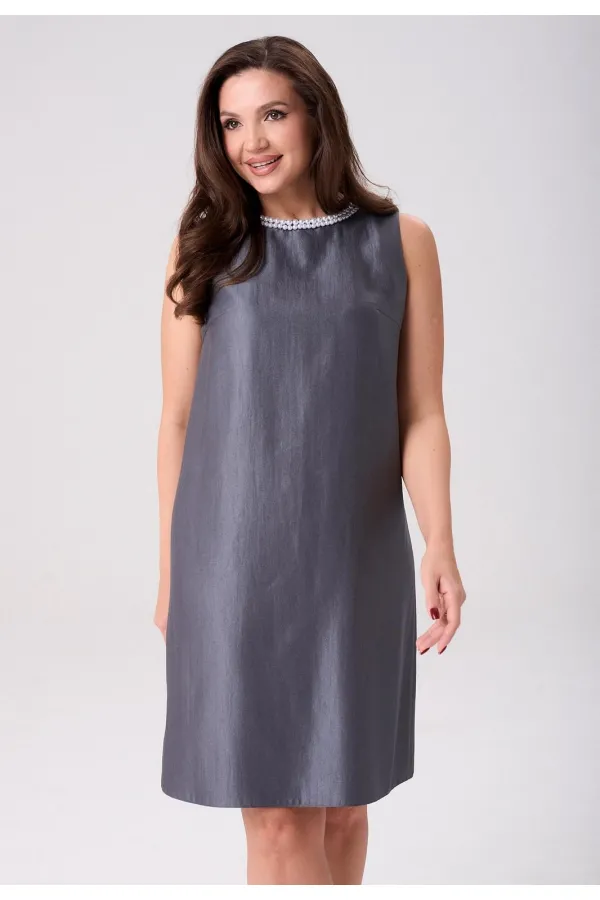 Платье А-силуэта с вытачками на полочке, и потайной молнией сзади, выполнено из кстюмно-плательной ткани, приятной на ощупь, с легким блеском. Горловина округлая, отделана бусинами под жемчуг. Длина платья от плеча по спинке для роста 164 см 93 см, для роста 170 см 95 см.