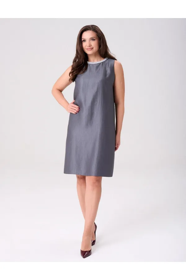 Платье А-силуэта с вытачками на полочке, и потайной молнией сзади, выполнено из кстюмно-плательной ткани, приятной на ощупь, с легким блеском. Горловина округлая, отделана бусинами под жемчуг. Длина платья от плеча по с... Читать далее...