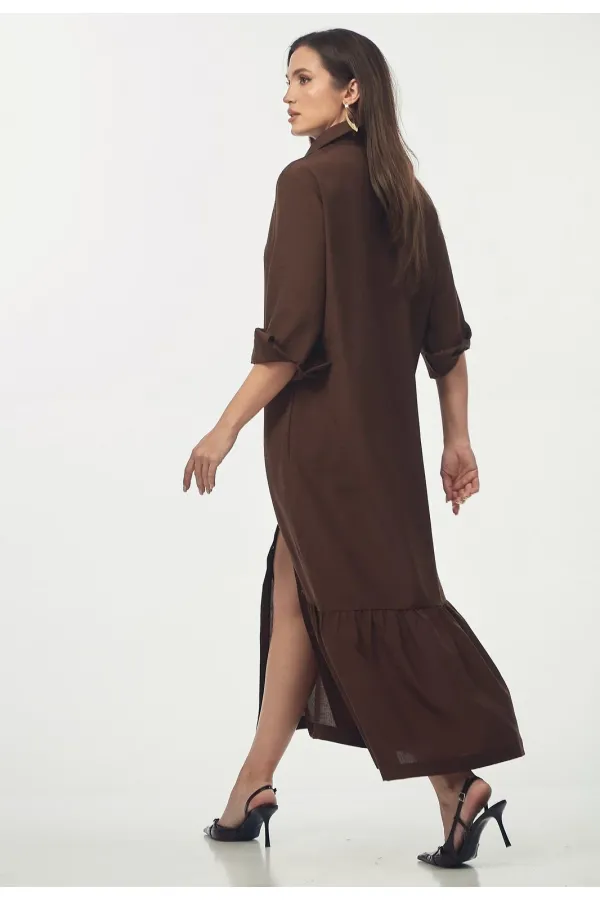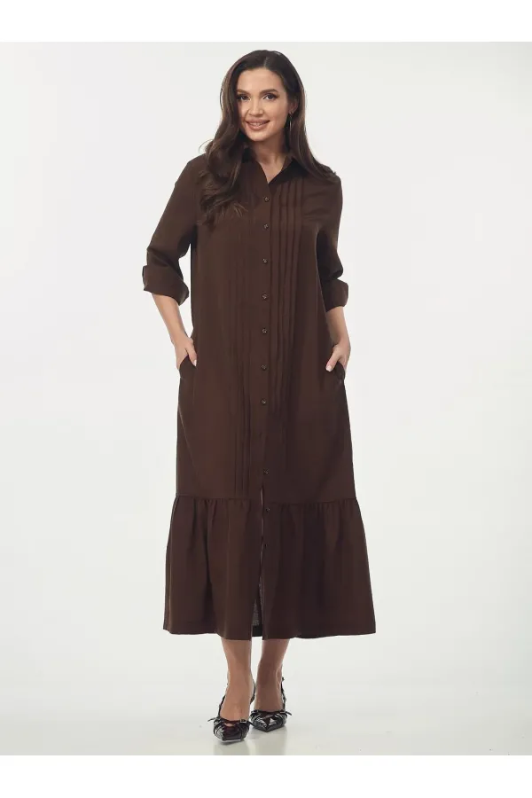 Платье-рубашка свободного силуэта. Воротник рубашечный. Центральная застежка на пуговицы по всей длине переда. Декоративные вертикальные складки вдоль планки визуально вытягивают силуэт. В боковых швах расположены карманы. Отрезная нижняя часть оформлена широким воланом, что придает образу женственности и легкости при ходьбе. Рукав втачной, заканчивается аккуратными манжетами на пуговицах. Длина рукава от плеча для роста 164 см 61, для роста 170 см 63 см. Длина платья от плеча по спинке для роста 164 см 130 см, для роста 170 см 134 см.