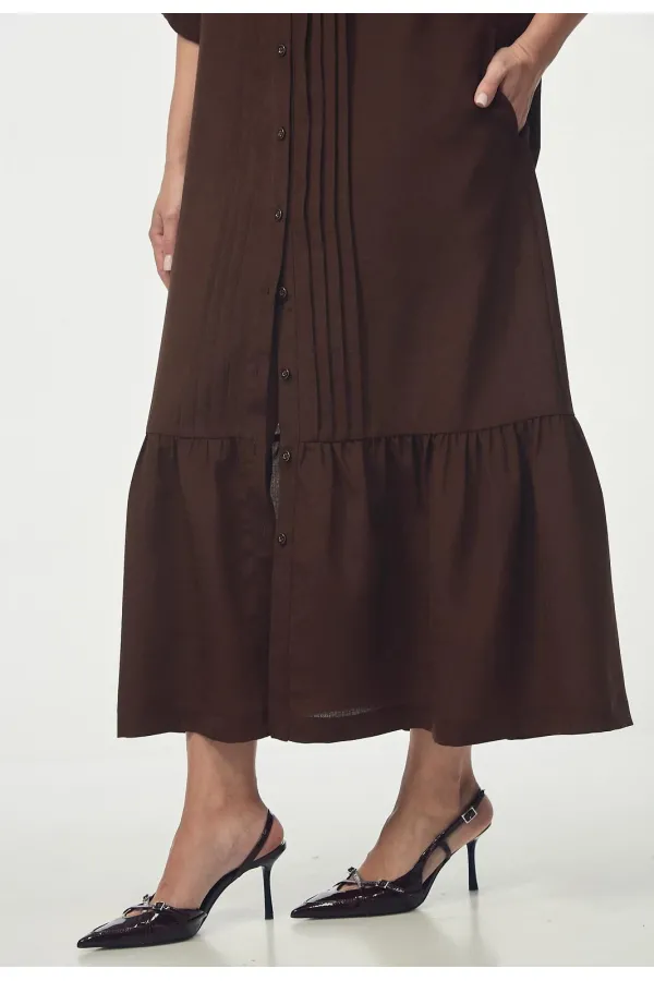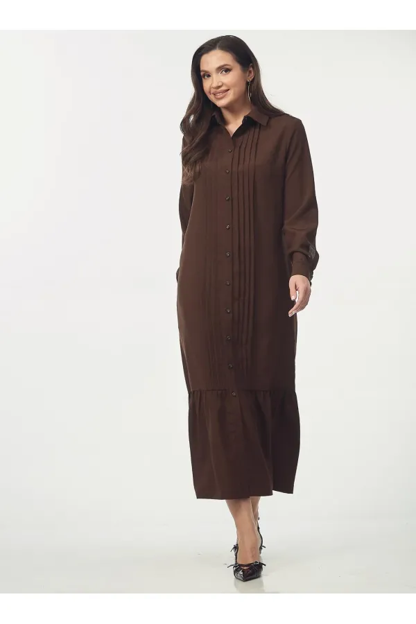Платье-рубашка свободного силуэта. Воротник рубашечный. Центральная застежка на пуговицы по всей длине переда. Декоративные вертикальные складки вдоль планки визуально вытягивают силуэт. В боковых швах расположены карманы. Отрезная нижняя часть оформлена широким воланом, что придает образу женственности и легкости при ходьбе. Рукав втачной, заканчивается аккуратными манжетами на пуговицах. Длина рукава от плеча для роста 164 см 61, для роста 170 см 63 см. Длина платья от плеча по спинке для роста 164 см 130 см, для роста 170 см 134 см.