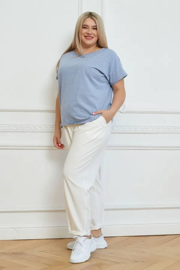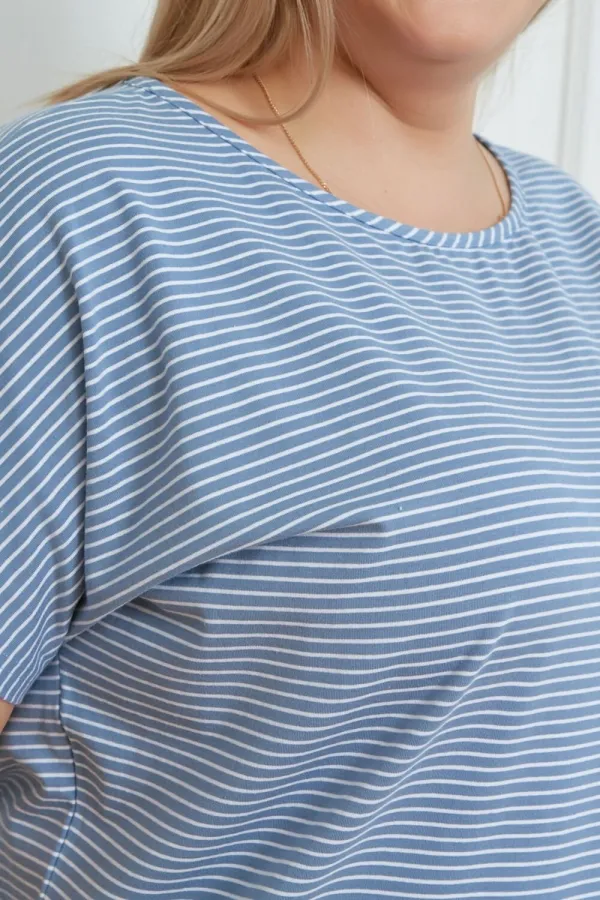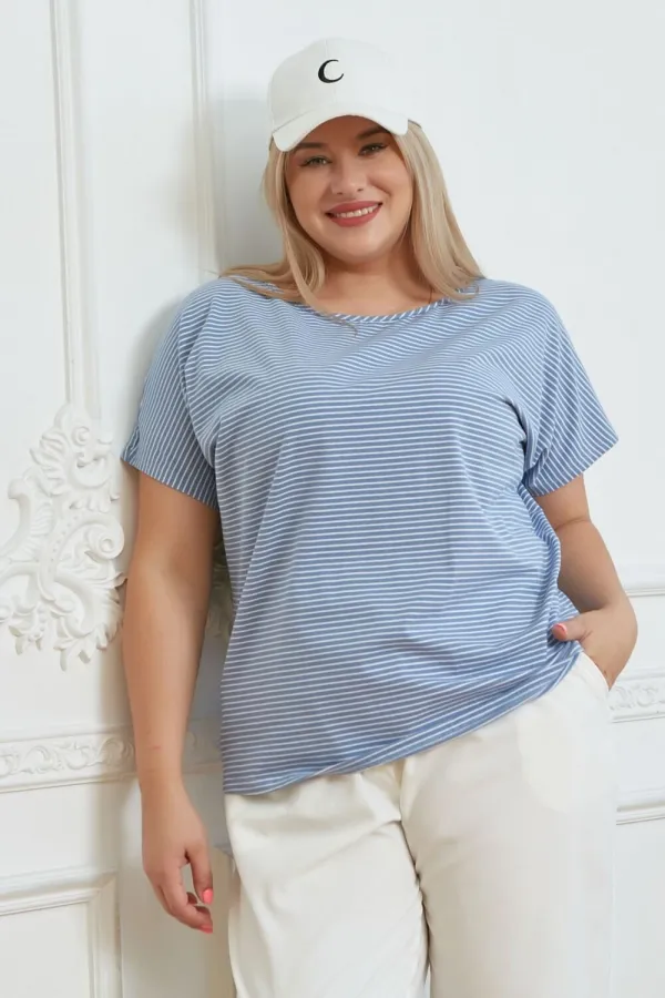 Практичная женская футболка от компании Luxury plus. Модель свободного силуэта, выполнена из эластичного вискозного трикотажа синего цвета с принтом полоска. Рукав цельнокроеный укороченный. Круглый вырез горловины ... Читать далее...