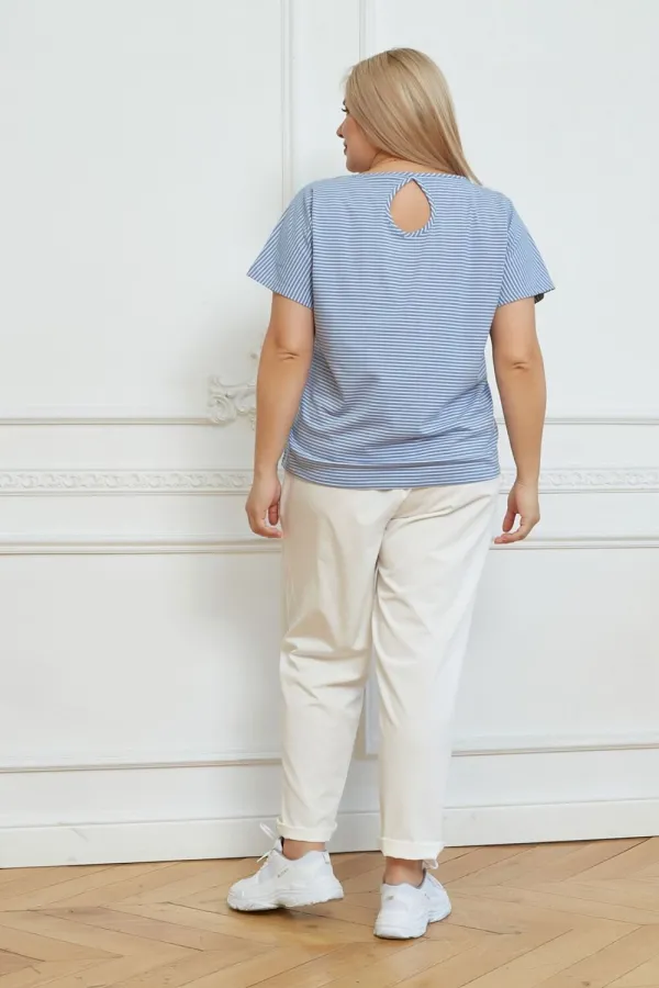 Практичная женская футболка от компании Luxury plus. Модель свободного силуэта, выполнена из эластичного вискозного трикотажа синего цвета с принтом полоска. Рукав цельнокроеный укороченный. Круглый вырез горловины и вырез "капля" по спинке обработаны окантовкой. Низ изделия ровный. Модель отлично дополнит комплект юбкам и брюкам.
