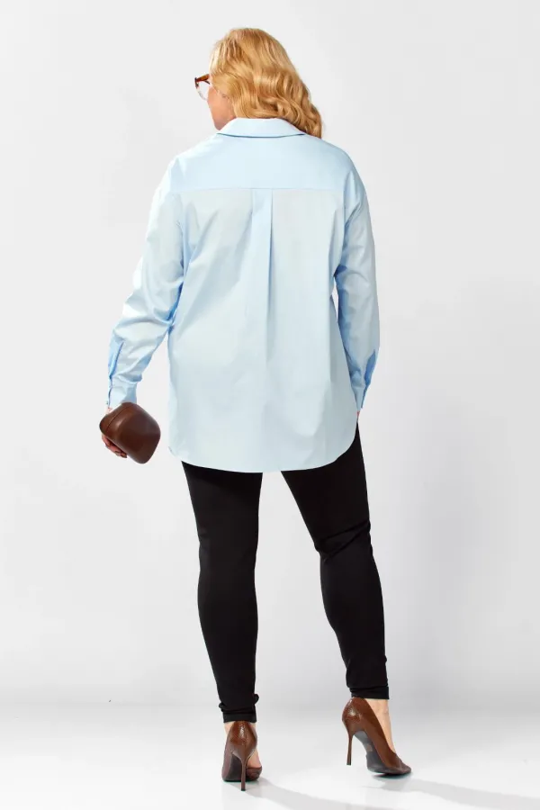 Рубашка свободного силуэта. Рукав рубашечный с разрезом и складками,заканчивается манжетой, которая застегивается на 2 петли и пуговицы.Плечо спущенное. На спинке двойная кокетка, от кокетки по центру спинки идет встречная складка. На переде вверху 2 симметричных накладных кармана. Длина по спинке(от точки основания шеи) -80см, длина по переду(от точки основания шеи)-75,5см, длина рукава+манжета-54,5см, длина плеча-21см. Ткань поплин, тянется по ширине. Параметры модели: обхват груди-108, обхват бедер-114, размер изделия на модели 56