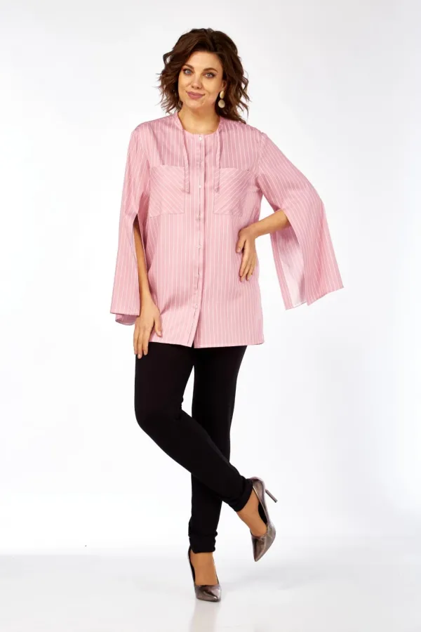 Рубашка свободного кроя, в стиле оверсайз. Силуэт свободный. На переде настрочены 2 кармана, покроеные по косой. Рукав длинный с разрезом спереди до локтя. Плечо спущенное. На спинке двойная кокетка. На переде фантазийная супатная застежка. Горловина круглая с узкой планкой по косой, переходящей в тесьму. Длина по спинке-79,5см, длина рукава-58см, длина плеча-15,5. Параметры модели: обхват груди-98см, обхват бедер-110см, размер изделия на модели 50.