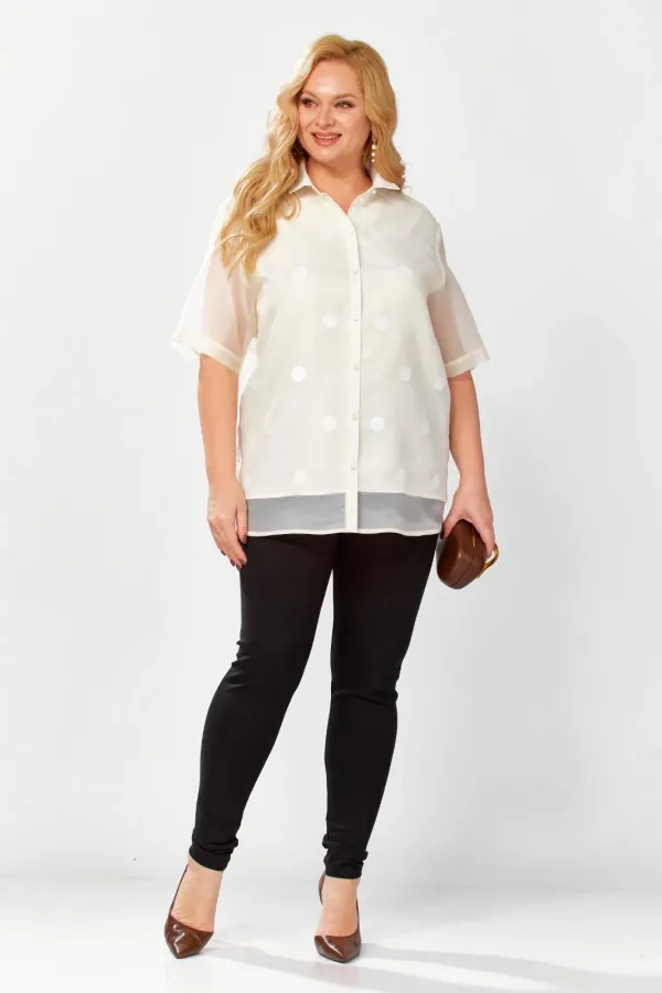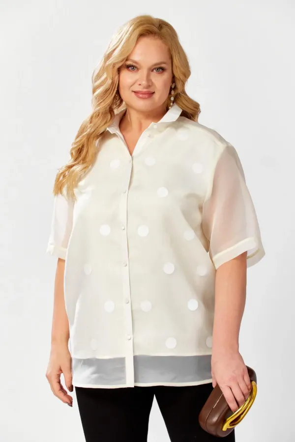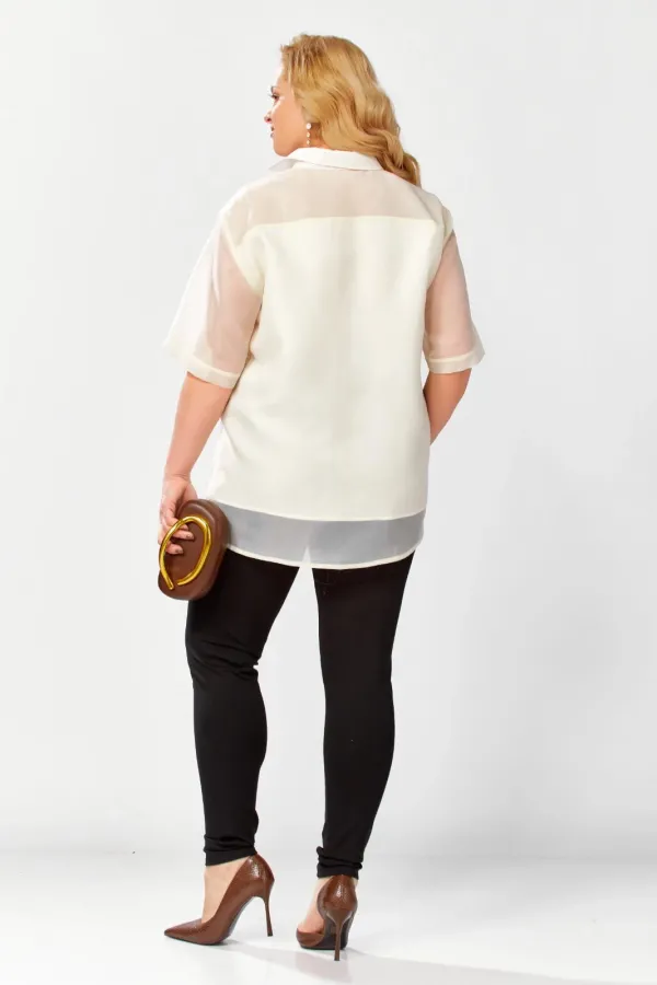 Рубашка свободного силуэта. Рукав рубашечный короткий. Плечо спущенное. На спинке двойная кокетка, обе из органзы. Верхний слой рубашки полностью выполен из органзы. На переде и спинке от кокетки вставлен нижний отлнтной слой рубашки(подклад), выполненный из штапеля. На переде на нижнем слое пришиты крупные круглые пайетки. Застежка на петли и пуговицы. Все внутренние швы окантованы. Длина по спинке(от точки основания шеи): органза-77,5см, штапель(от кокетки)-55,5см; длина рукава-30см, длина плеча-15,5см. Параметры модели: обхват груди-108см, обхват бедер-114см, размер изделия на модели 54