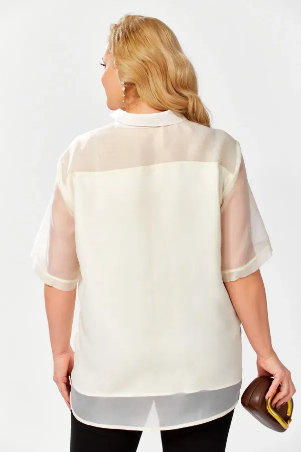 Рубашка свободного силуэта. Рукав рубашечный короткий. Плечо спущенное. На спинке двойная кокетка, обе из органзы. Верхний слой рубашки полностью выполен из органзы. На переде и спинке от кокетки вставлен нижний отлнтной... Читать далее...