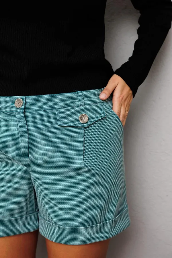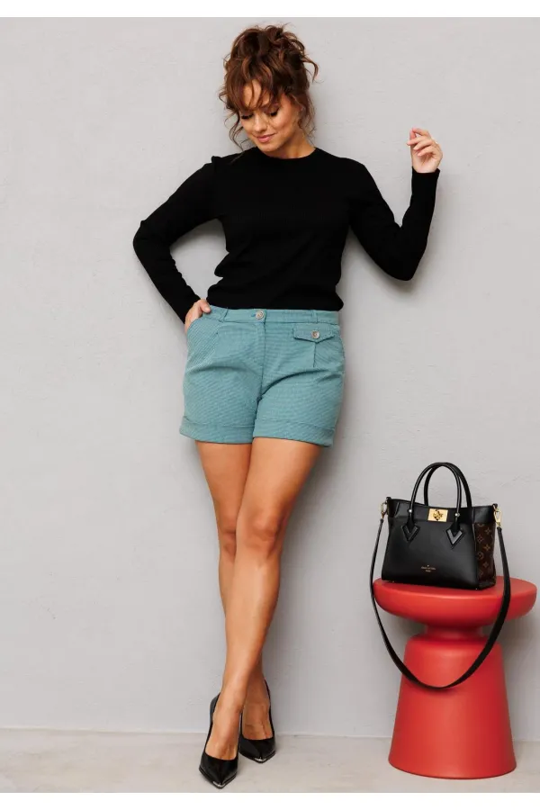 На модели представлены шорты прямого кроя средней посадки. На передней части шорт имеются два кармана с отрезным бочком, что придает удобства в повседневной носке, а отделочный клапан придает изюминку модели.
