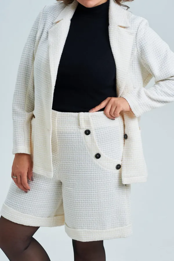 Наши шорты из шерстяной ткани будут комфортны для использования осенью и зимой, актуальны для офисного стиля. На фото представлены с жакетом 6007. Оба изделия можно купить комплектом 6005.