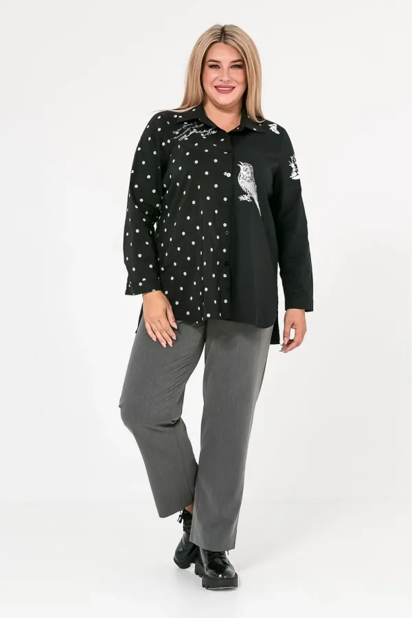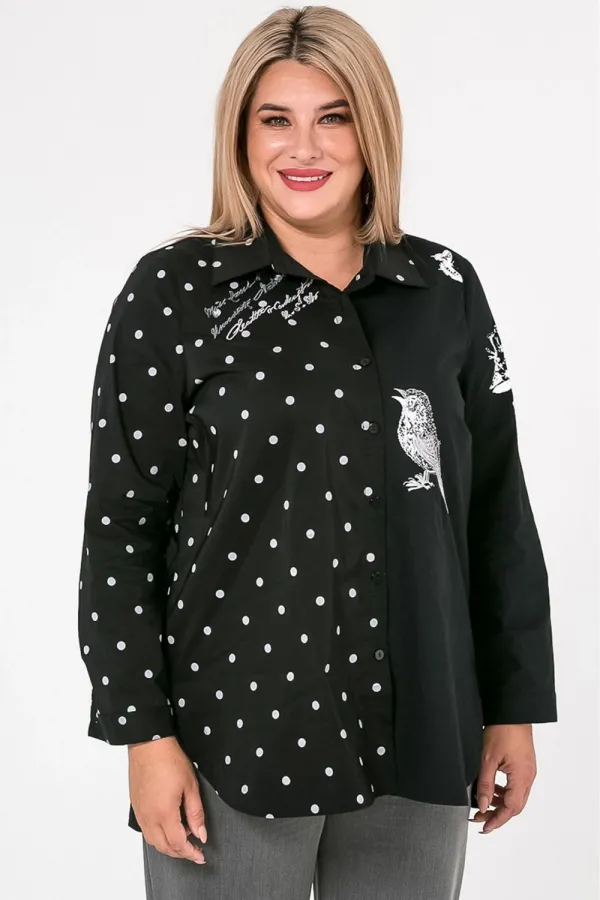 Стильная женская рубашка от компании Luxury plus. Модель прямого силуэта длиной до линии бёдер, выполнена из хлопкового полотна чёрного цвета с принтом и вышивкой. Круглая горловина оформлена отложным воротником с отрезной стойкой. Рукав длинный до запястья с отрезной манжетой и застёжкой на петлю и пуговицу. В боковых швах разрезы. Низ переда закруглен и обработан обтачкой, низ спинки прямой и длиннее переда. Центральная застёжка выполнена на петли и пуговицы. Прекрасный вариант для создания неповторимого образа.
