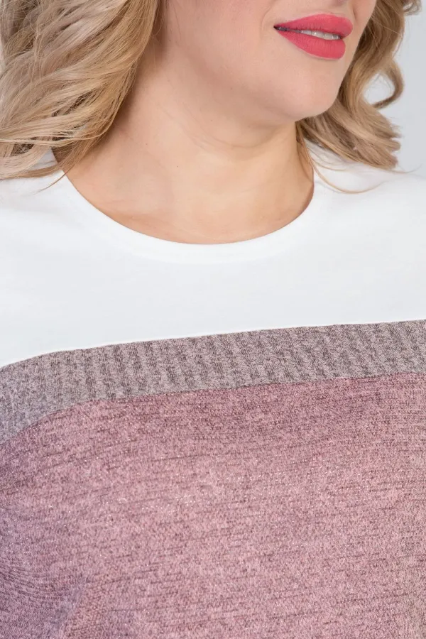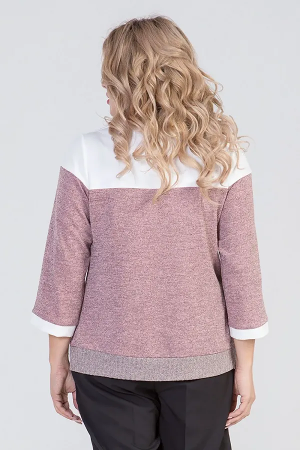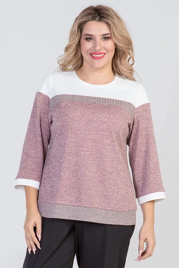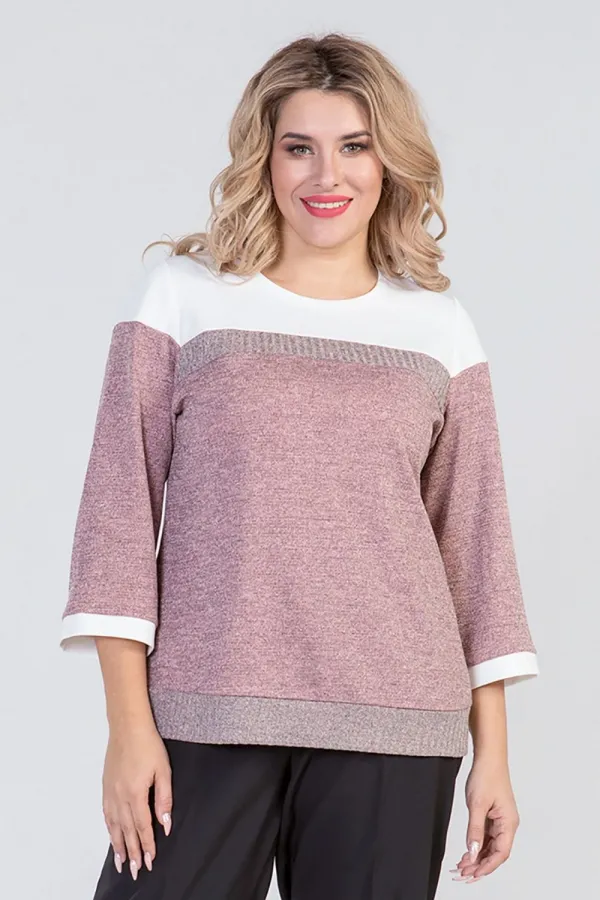 Стильный женский джемпер от компании Luxury plus. Модель полуприлегающего силуэта, выполнена из меланжевой ткани с люрексом розового цвета. Кокетка переда, спинки и рукава выполнены из однотонного трикотажного полотна. Круглый вырез горловины обработан внешней обтачкой. Укороченный втачной рукав, длиной 3/4 с контрастной манжетой по низу. Низ с притачным однотонным поясом. Джемпер станет отличным выбором для Вашего повседневного образа.