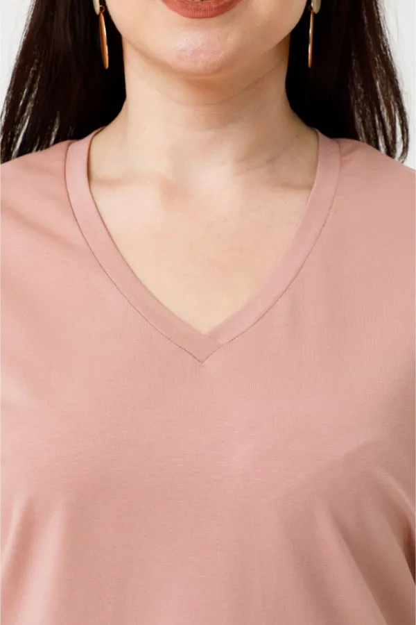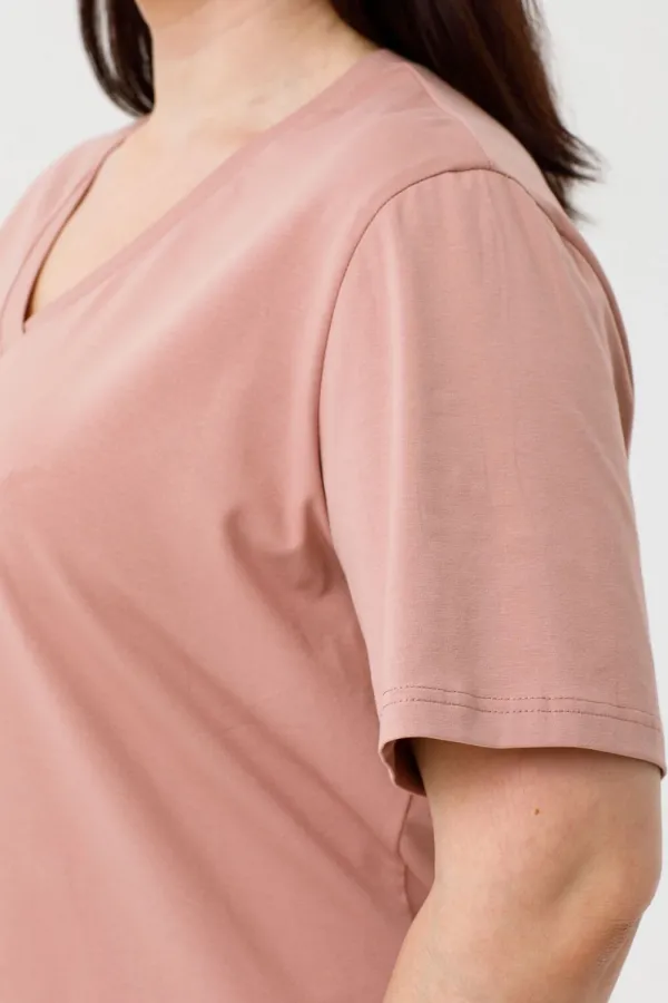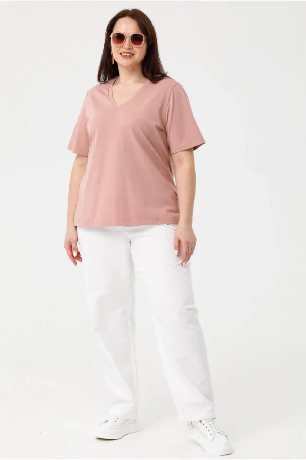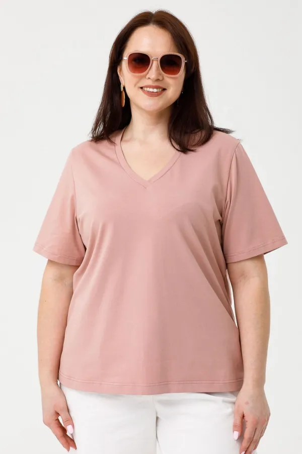 Трикотажная футболка в пудровом цвете от компании Luxury plus. Комфортная футболка приталенного силуэта. V-образный вырез горловины обработан бейкой. Рукава короткие втачные. Низ изделия прямой. Модель отлично сочетается с джинсами, брюками или юбками. Комфортный вариант для жаркого лета!