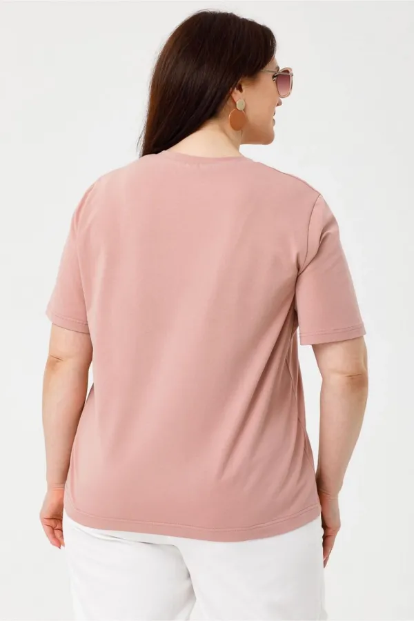 Трикотажная футболка в пудровом цвете от компании Luxury plus. Комфортная футболка приталенного силуэта. V-образный вырез горловины обработан бейкой. Рукава короткие втачные. Низ изделия прямой. Модель отлично сочетается... Читать далее...