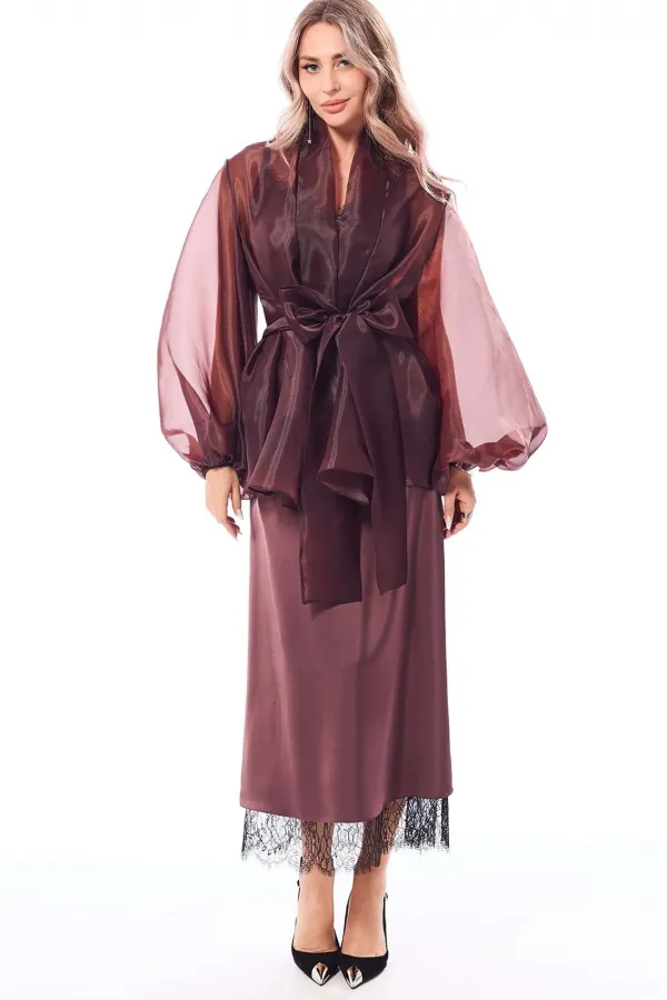 Туника без застежки, с отрезной планкой горловины. Плечо спущенное. Рукав длинный, с отрезной манжетой. По шву притачивания манжеты рукав присборен. Туника со съемным поясом.