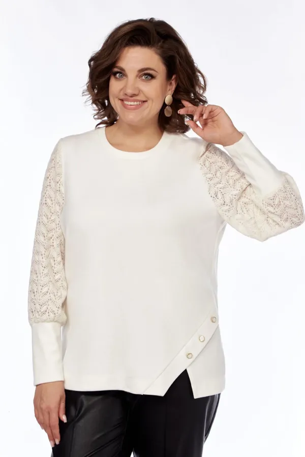 Джемпер женский нарядный, прямого силуэта, выполнен из трикотажного полотна. Горловина округлой формы. Низ переда с асимметричным элементом, декорированный пуговицами. Спинка цельнокроенная. Рукава втачные на манжете выполнены из ажурного трикотажного полотна.