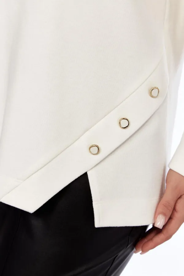 Джемпер женский нарядный, прямого силуэта, выполнен из трикотажного полотна. Горловина округлой формы. Низ переда с асимметричным элементом, декорированный пуговицами. Спинка цельнокроенная. Рукава втачные на манжете в... Читать далее...