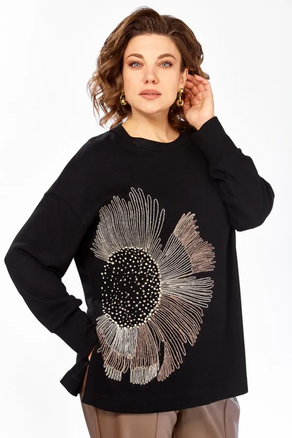 Джемпер женский, свободного кроя, изготовлен из трикотажного полотна. Горловина круглой формы. На полочке — вышивка. Спинка цельнокроенная. Рукава спущеные, с манжетам по низу. В боковых швах разрезы. Длина джемпера по спинке — 69 см, длина плеча + рукав — 73 см.