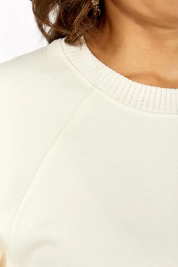 Джемпер женский, свободного кроя, изготовлен путем комбинирования трикотажного полотна. Горловина круглой формы. Рукава — реглан. В боковых швах обработаны разрезы внизу. Горловина, низ изделия и низ рукавов изготовлены из отделочного трикотажного полотна. Отделка нашивка по переду.