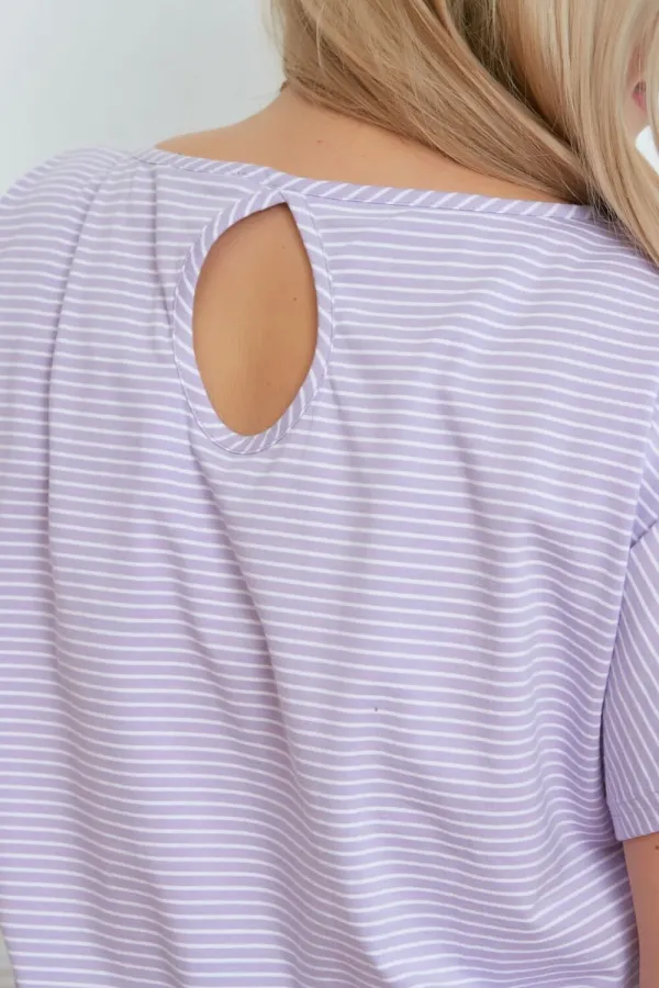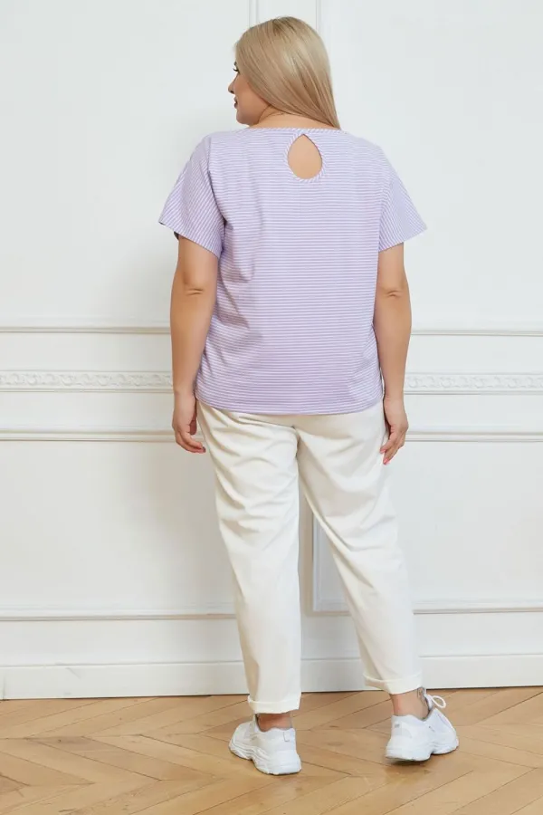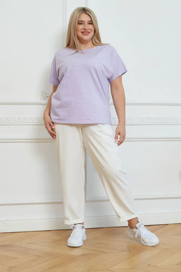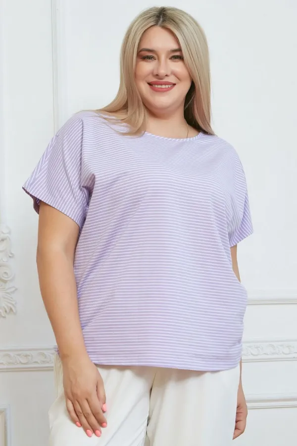 Удобная женская футболка от компании Luxury plus. Модель свободного силуэта, выполнена из эластичного вискозного трикотажа сиреневого цвета с принтом полоска. Рукав цельнокроеный укороченный. Круглый вырез горловины и вырез "капля" по спинке обработаны окантовкой. Низ изделия ровный. Модель отлично дополнит комплект юбкам и брюкам.