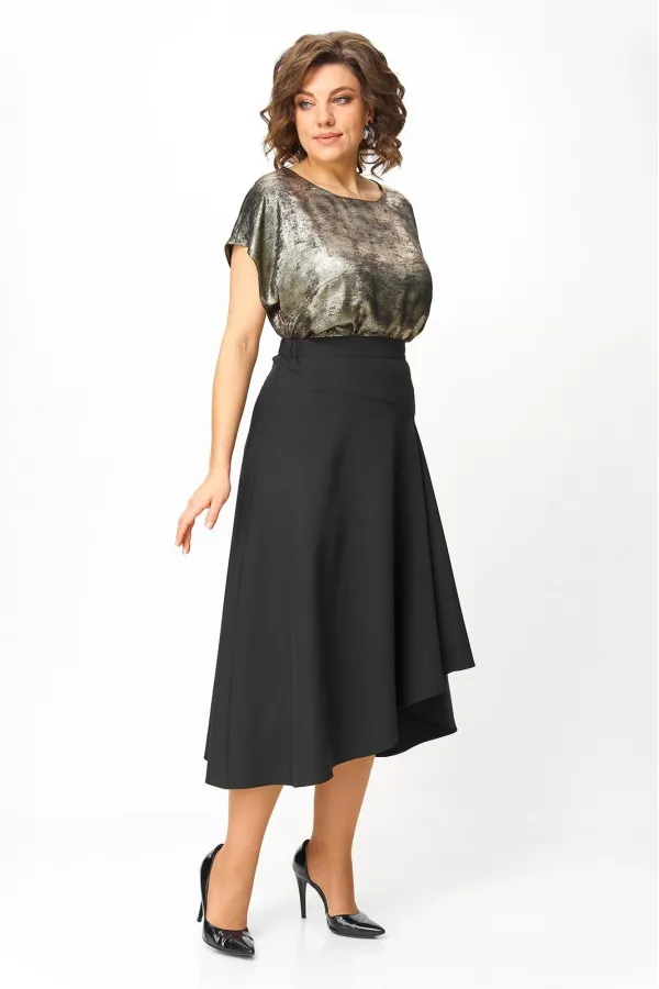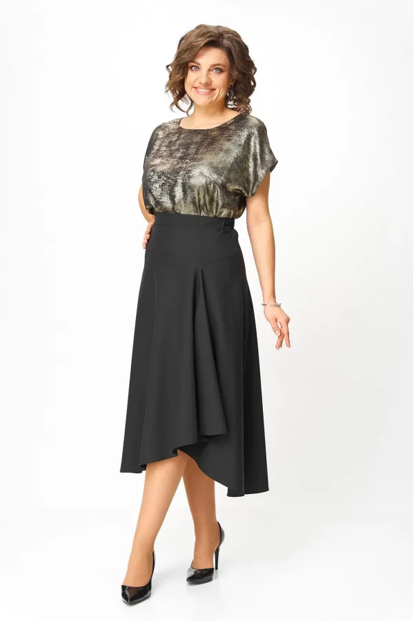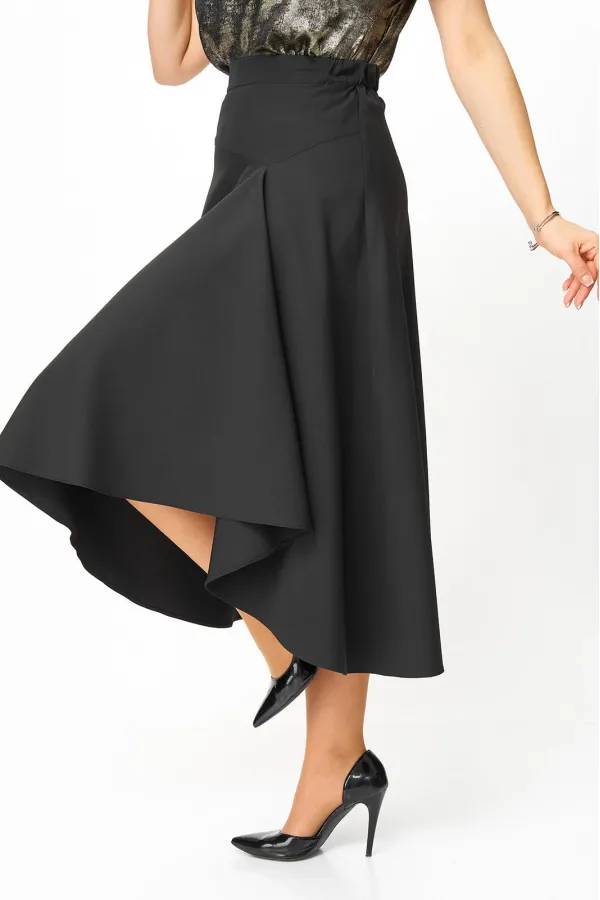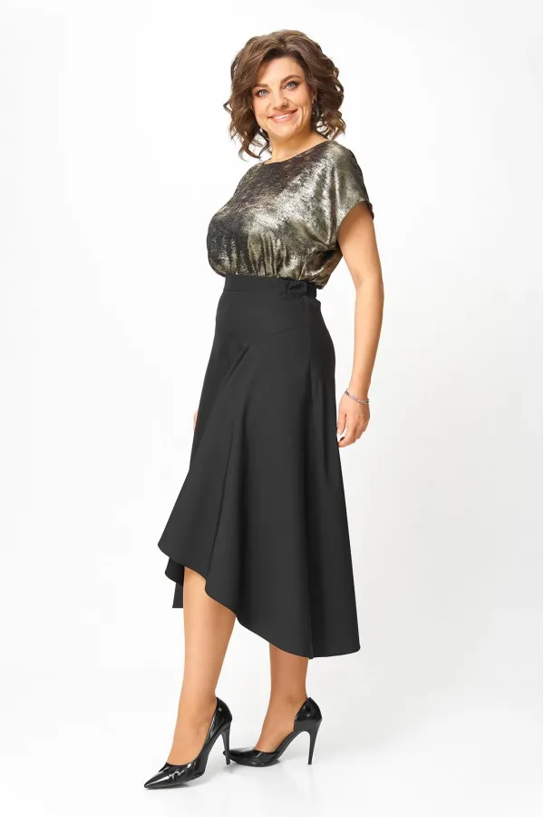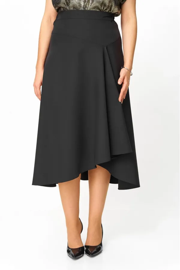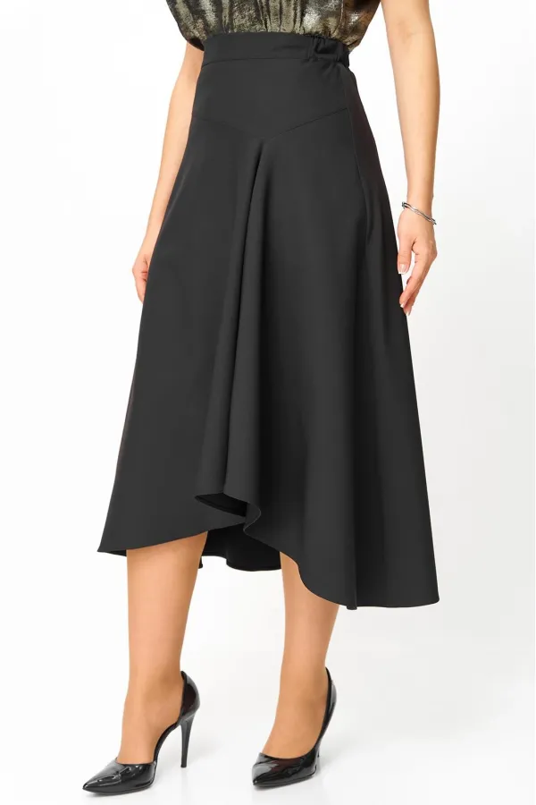 Передняя часть юбки с отрезной кокеткой и конструктивным элементом в виде драпировки и укороченного низа в области левой ноги. Задняя часть юбки со средним швом, в верхней части которго обработана потайная молния. Юбка на притачном поясе, с эластичной тесьмой и застежкой на петлю и пуговицу.Параметры изделия представлены на фото.