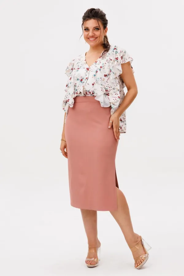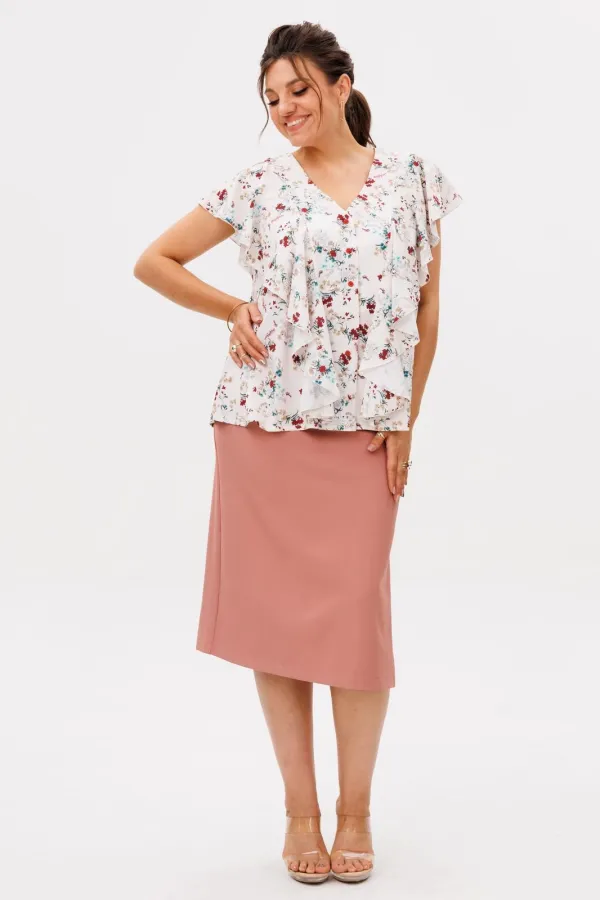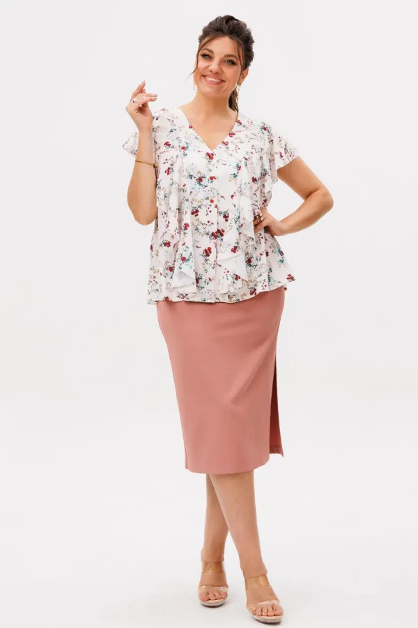 На модели в юбке цвета «карамельный силуэт» блуза 1670.Размер 44: ОТ-70; ОБ-93; ДИ по боку-74;